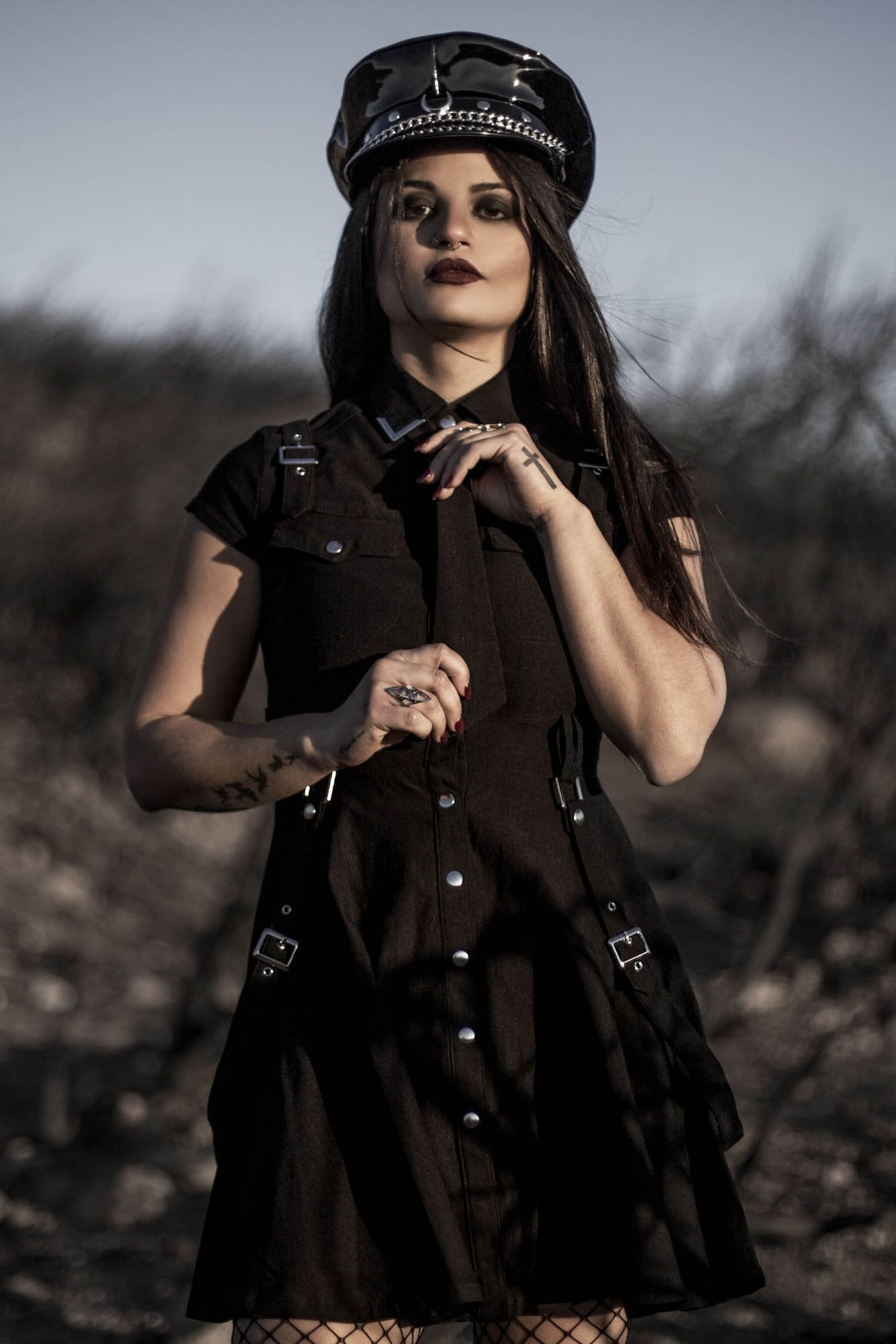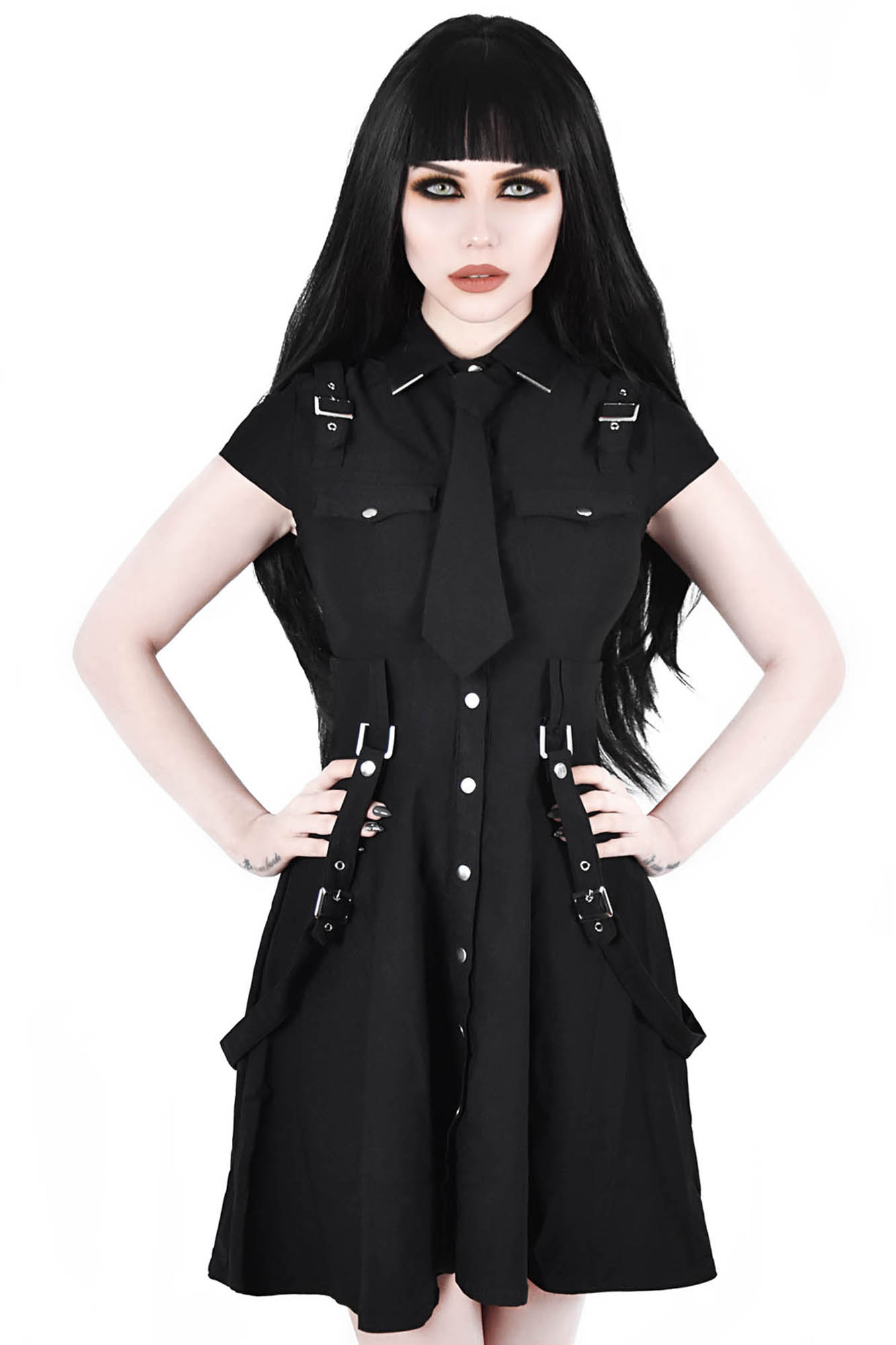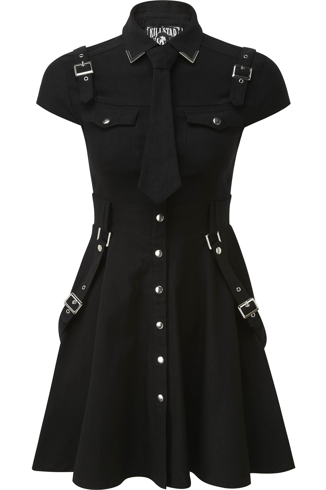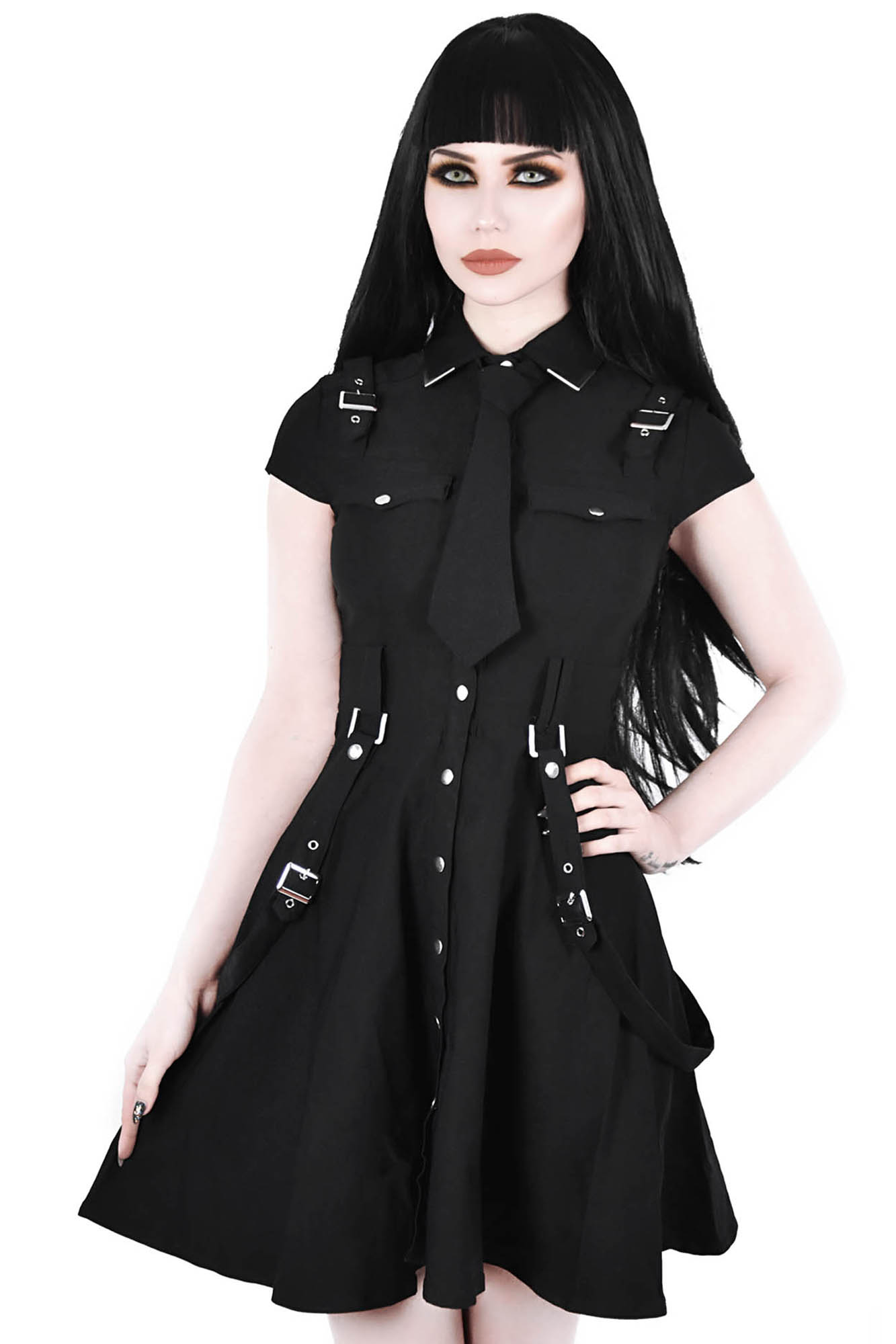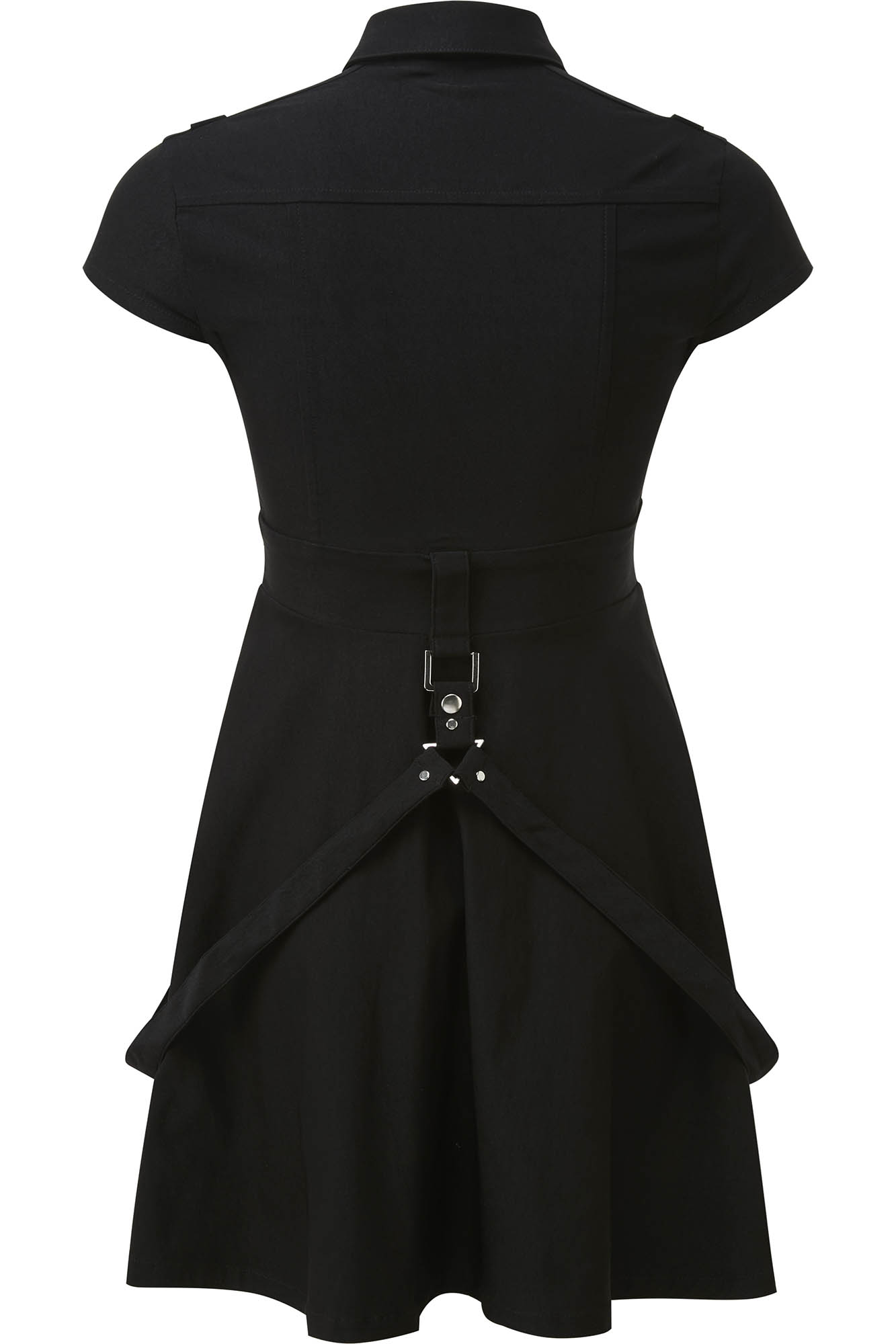 Be ready to join the '13th Infantry' division dress - a spirited skater dress in a super stretch woven-fabric for a flattering fit, guaranteed to keep heads rollin' when yer out! With a folded collar with metal tips, optional tie, belt loops, and statement buckles and straps - contrasting hardware and a full button-up front. Complete with cap sleeves and generously flared skirt. Perfect for nights out, hot photoshoots or adventures up and beyond.