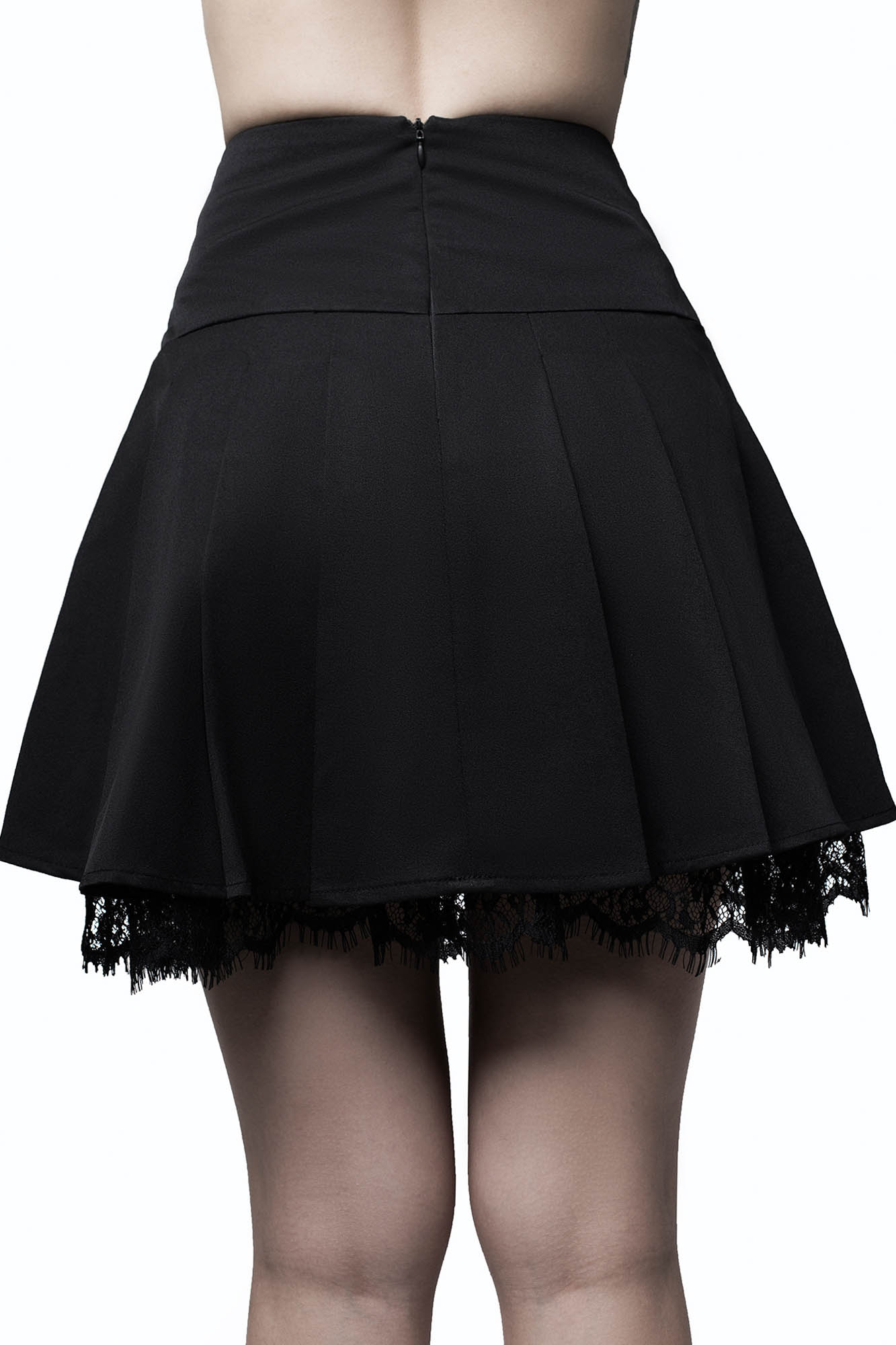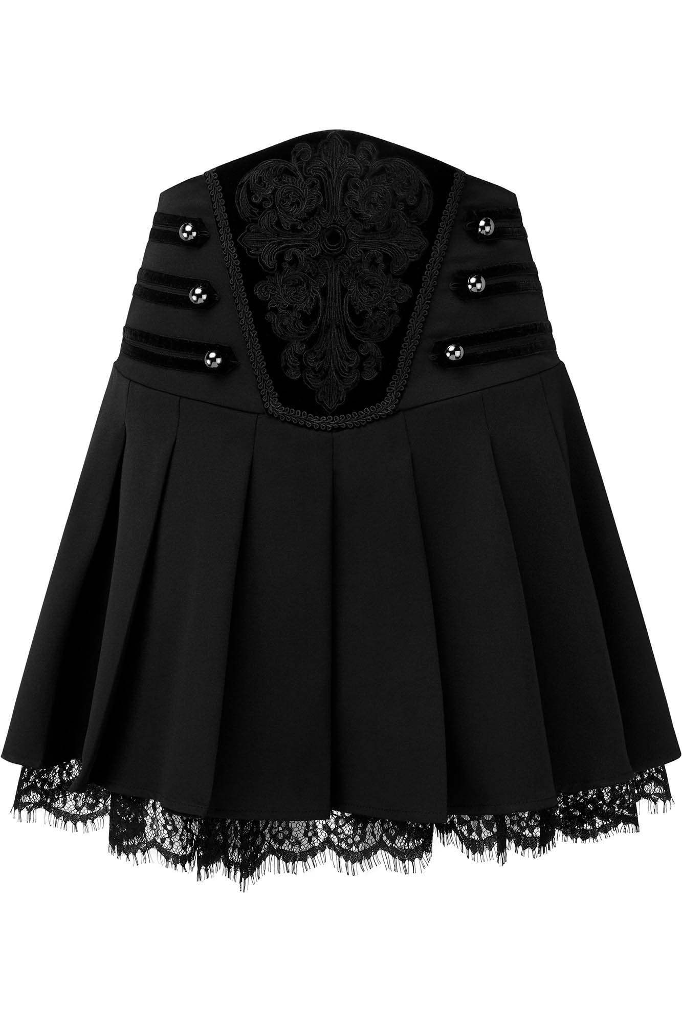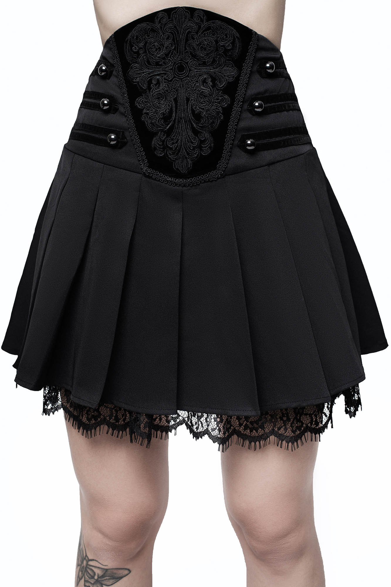 Our new obsession! The 'Abbey' pleated mini-skirt is as versatile as the moon phases; amazing stretch-material that hugs yer body and a lush velvet panel with decadent black-on-black embroidery. High waisted fit with pleats, delicate trims, and zip to the back for easy on/off. Effortless to style and can be dressed up or down depending on yer own moon/mood!