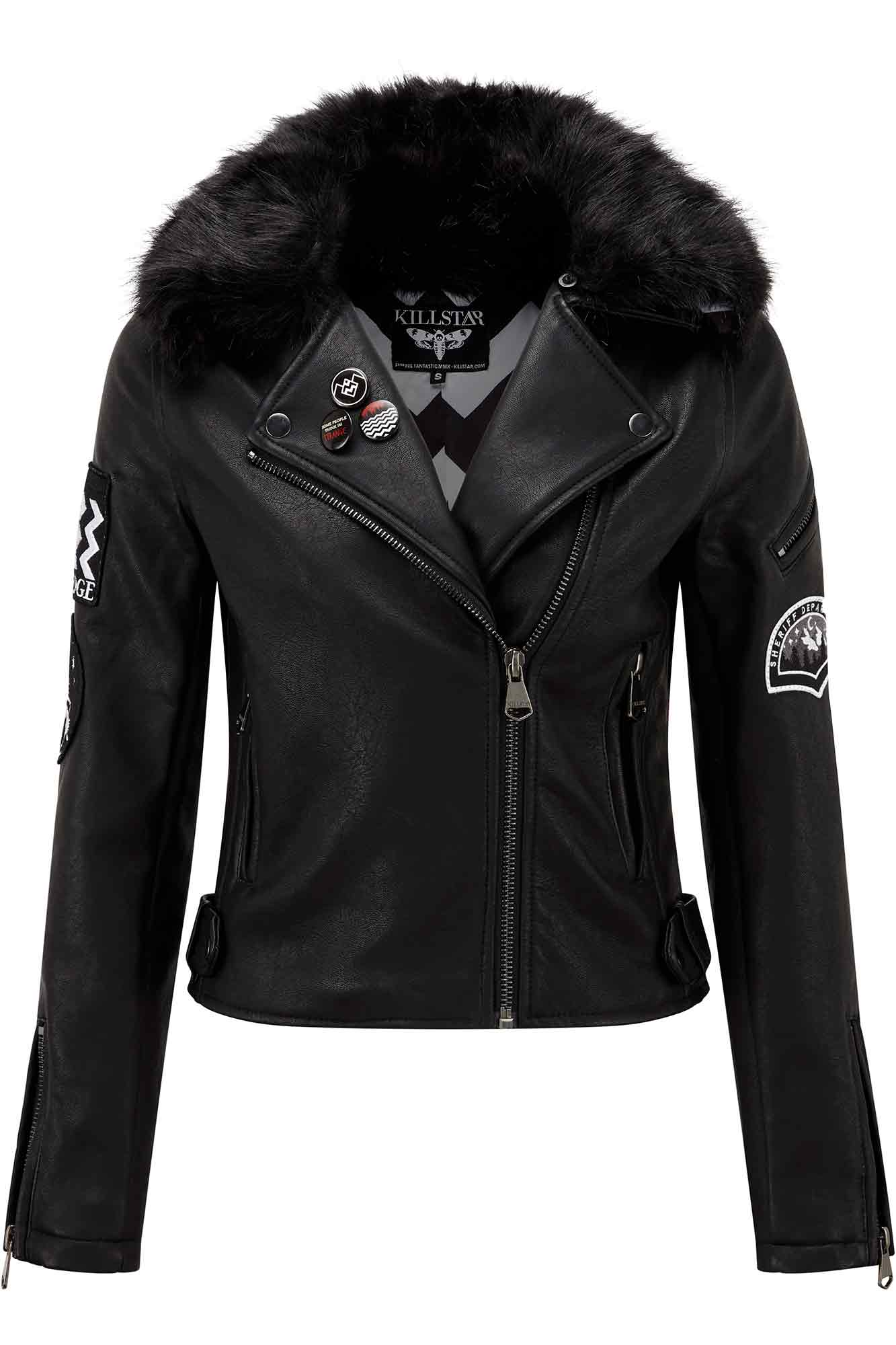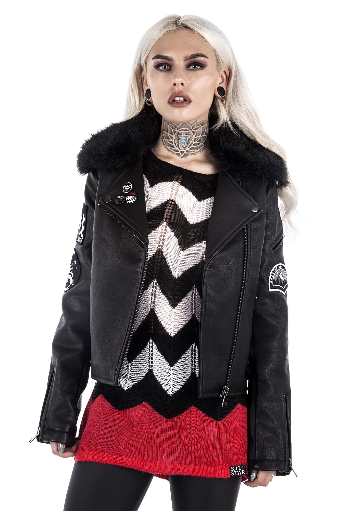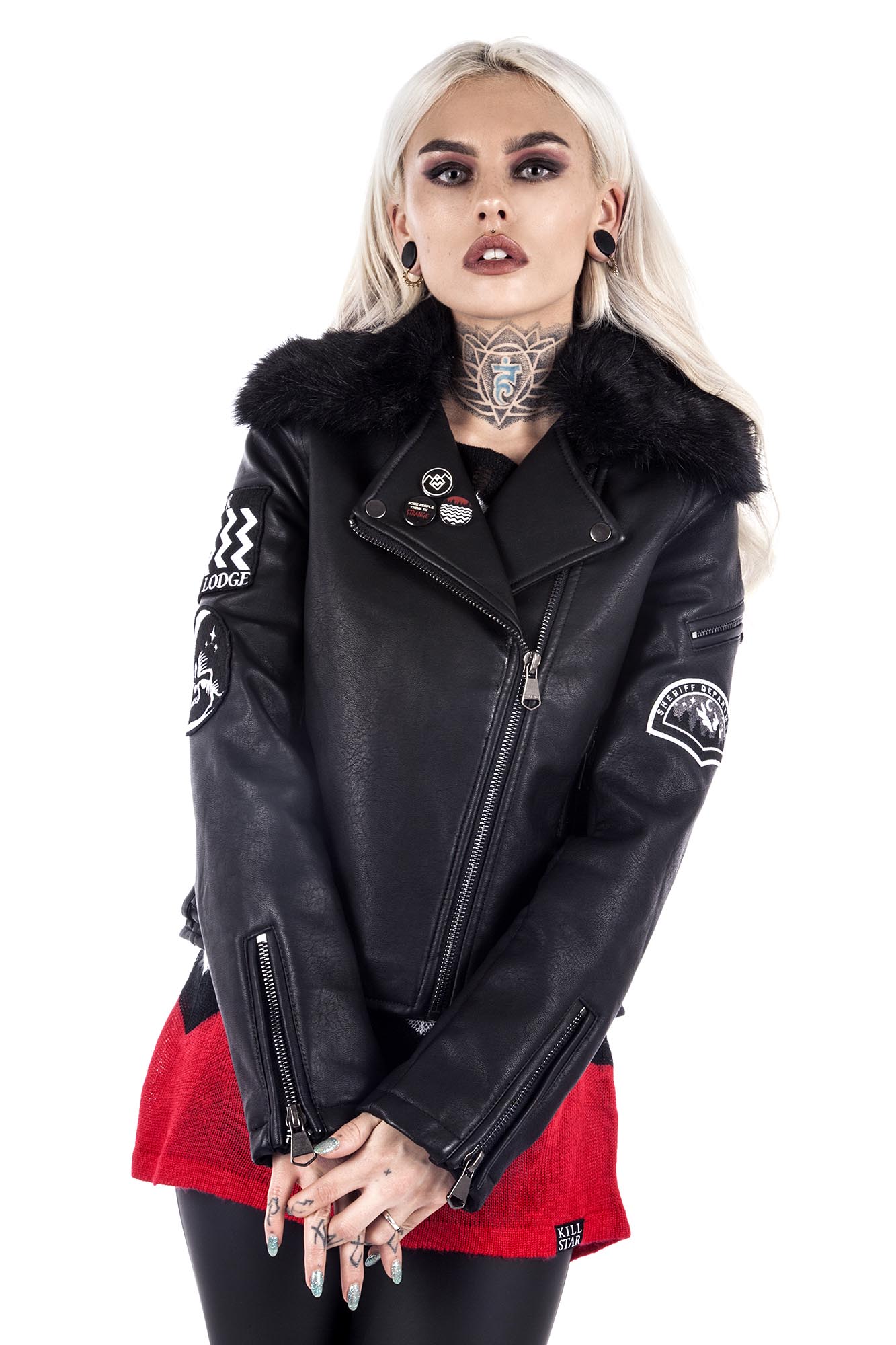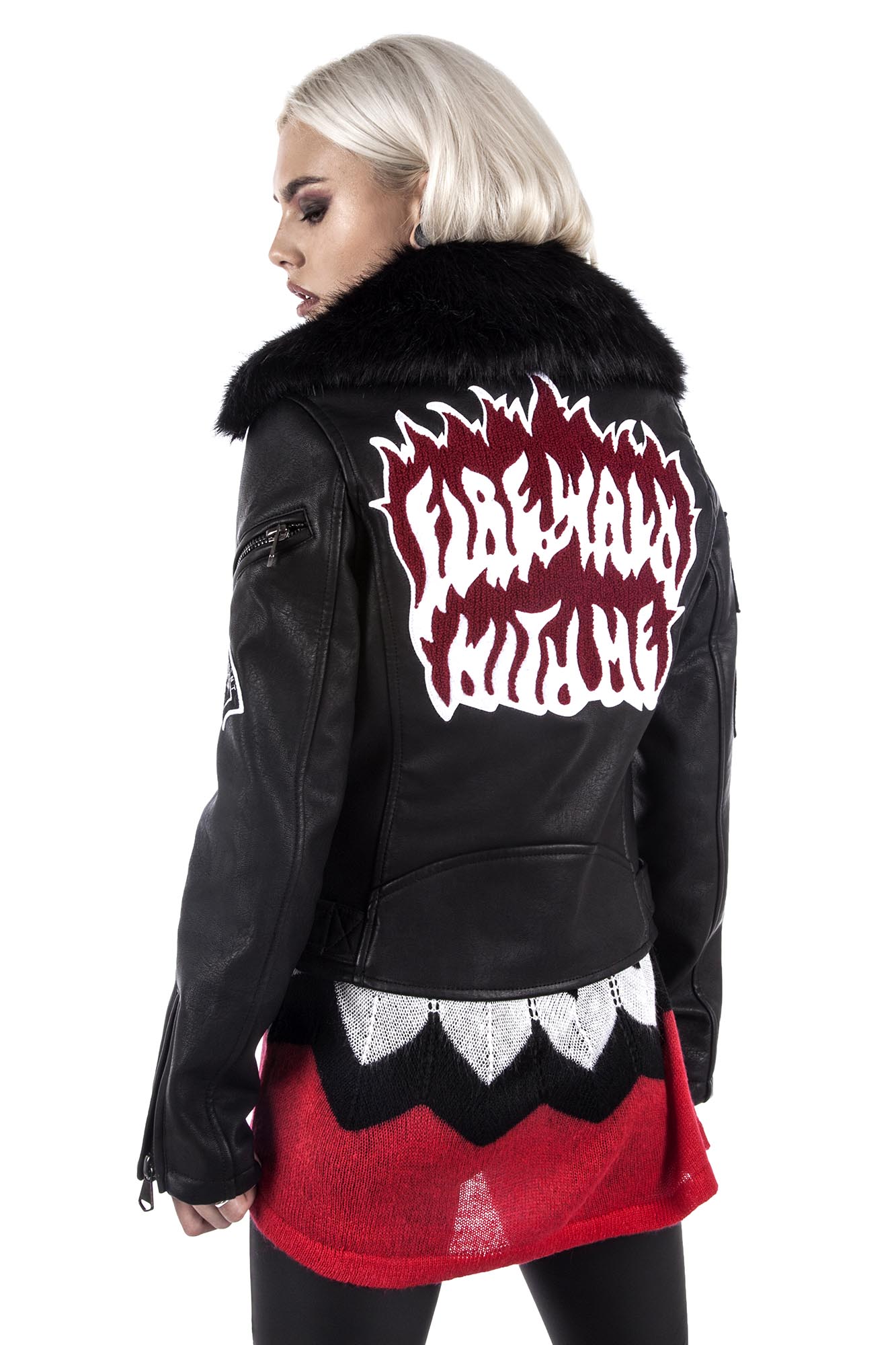 Satisfy yer strange mind with a new classic leather biker for the cool dayz comin'.  Overloaded with rad detailing; zipped front + pockets/sleeves, faux fur collar, accent pins, large super soft chenille back-patch, statement sleeve patches and complete with a chevron satin-lining. And of course - all in a hyper realistic and textured vegan leather.