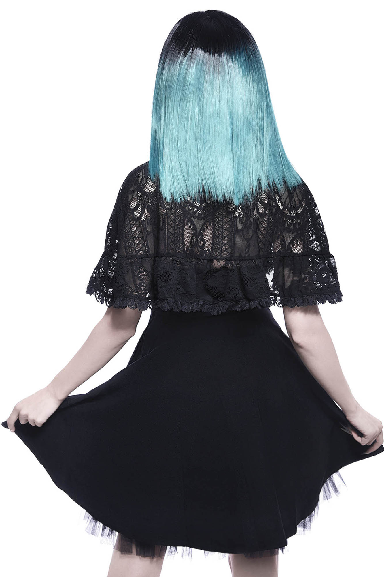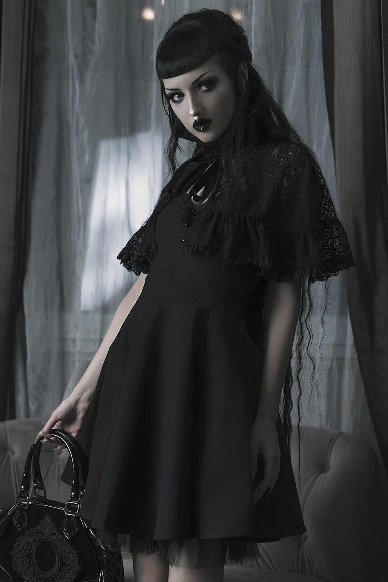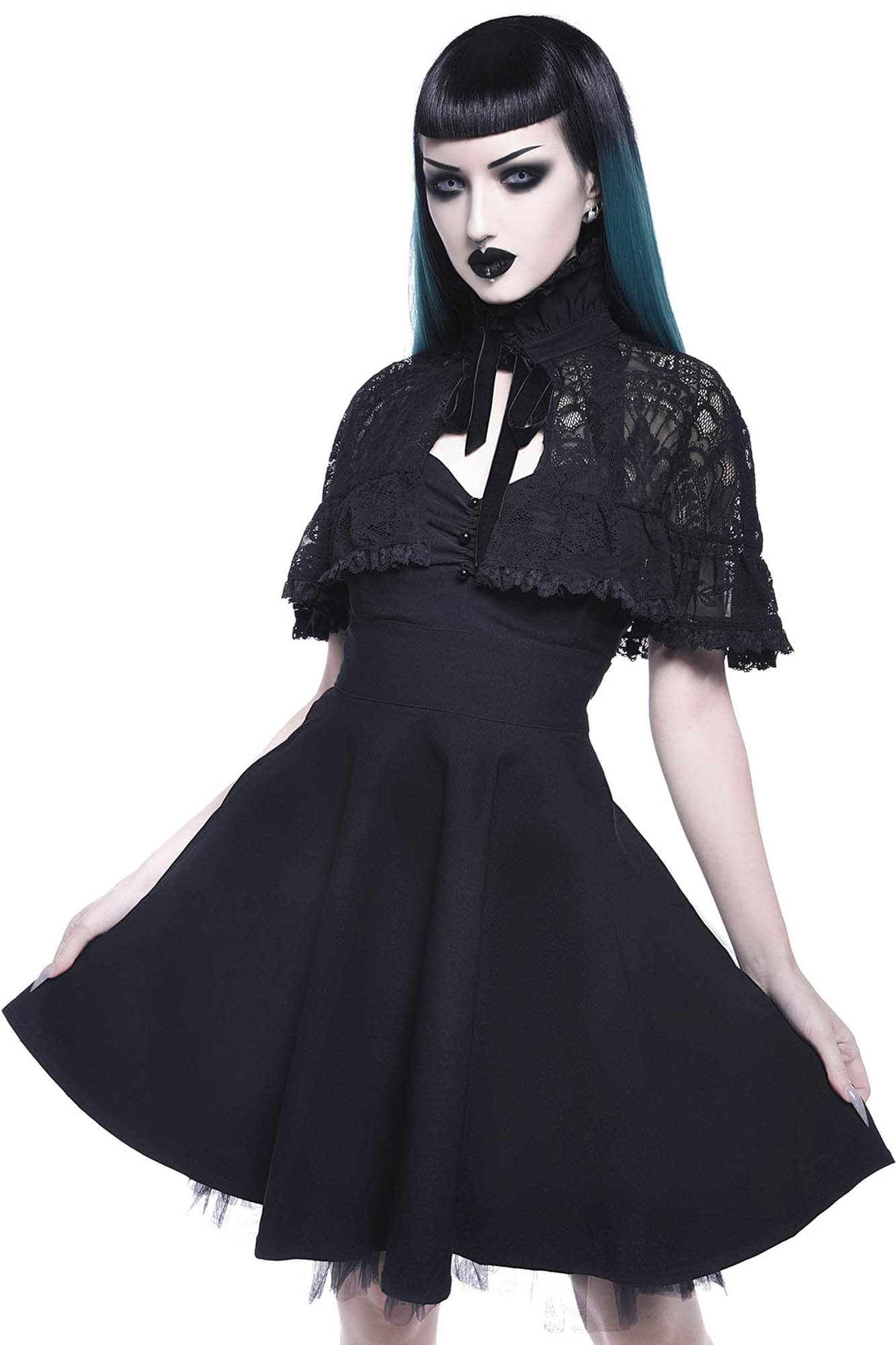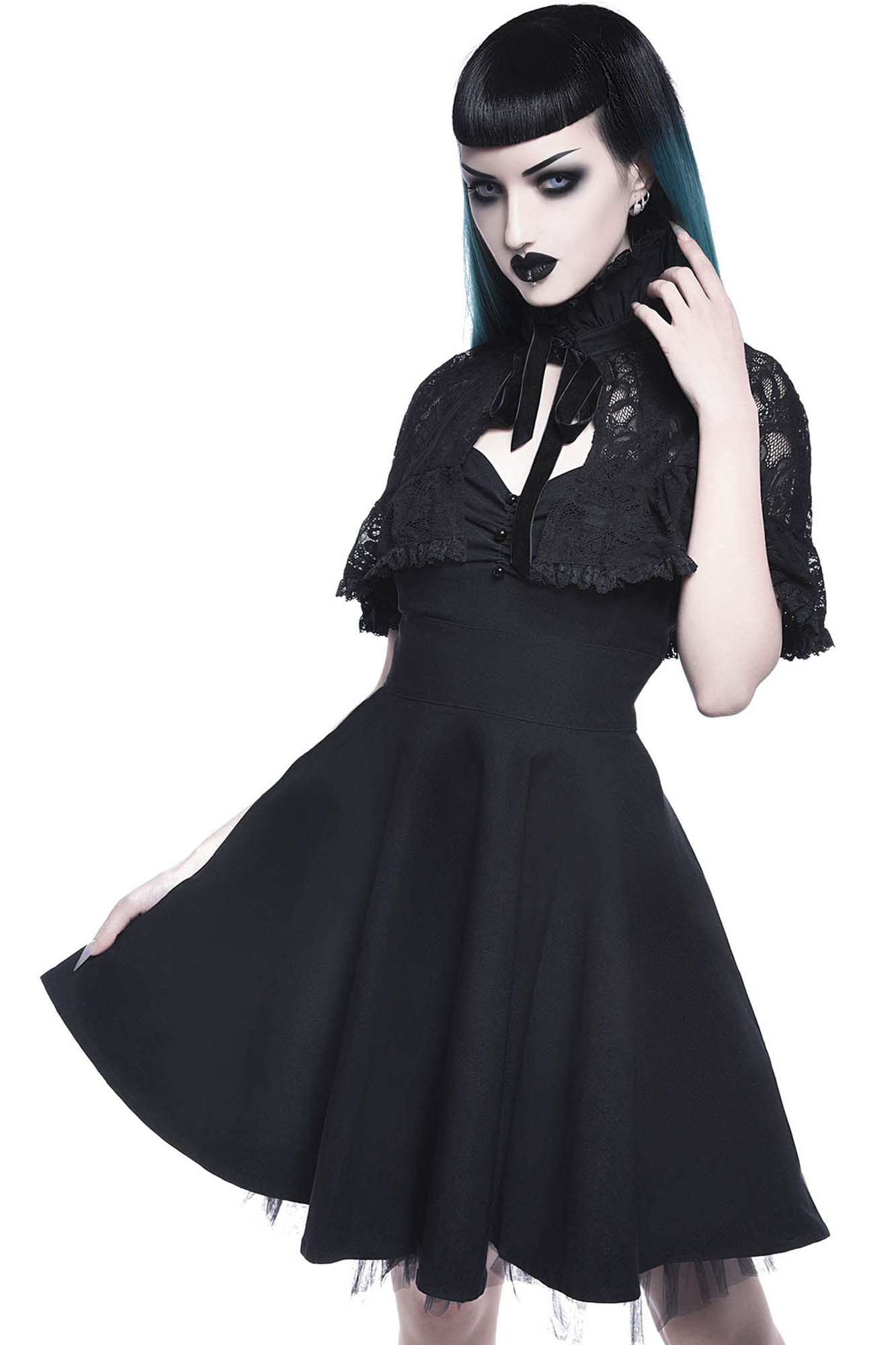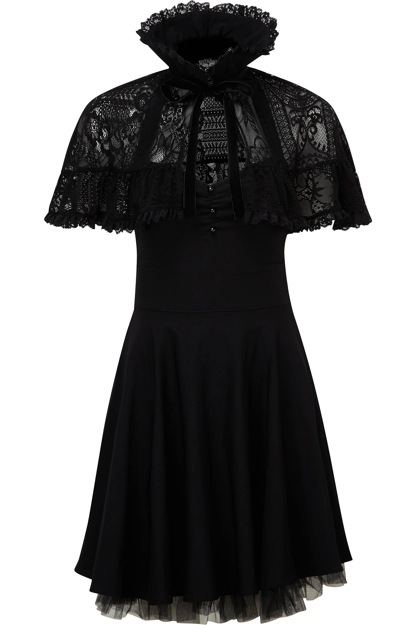 Wishing the night will never end with the 'Ambrose' party dress. Channeling a vintage vibe with its figure-hugging fit, constructed of woven stretch fabric for ultimate feel + comfort. With a halterneck and open chest, decorative buttons and generously flared skirt with tulle. Complete with a statement lace-cape to finish off the look! Fits like a glove - purrfect for date night, parties or just yer daily/nightly adventures.