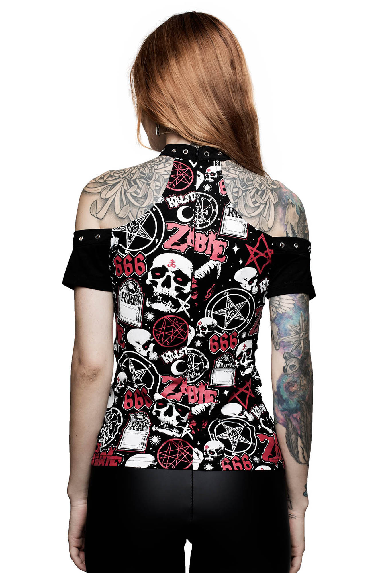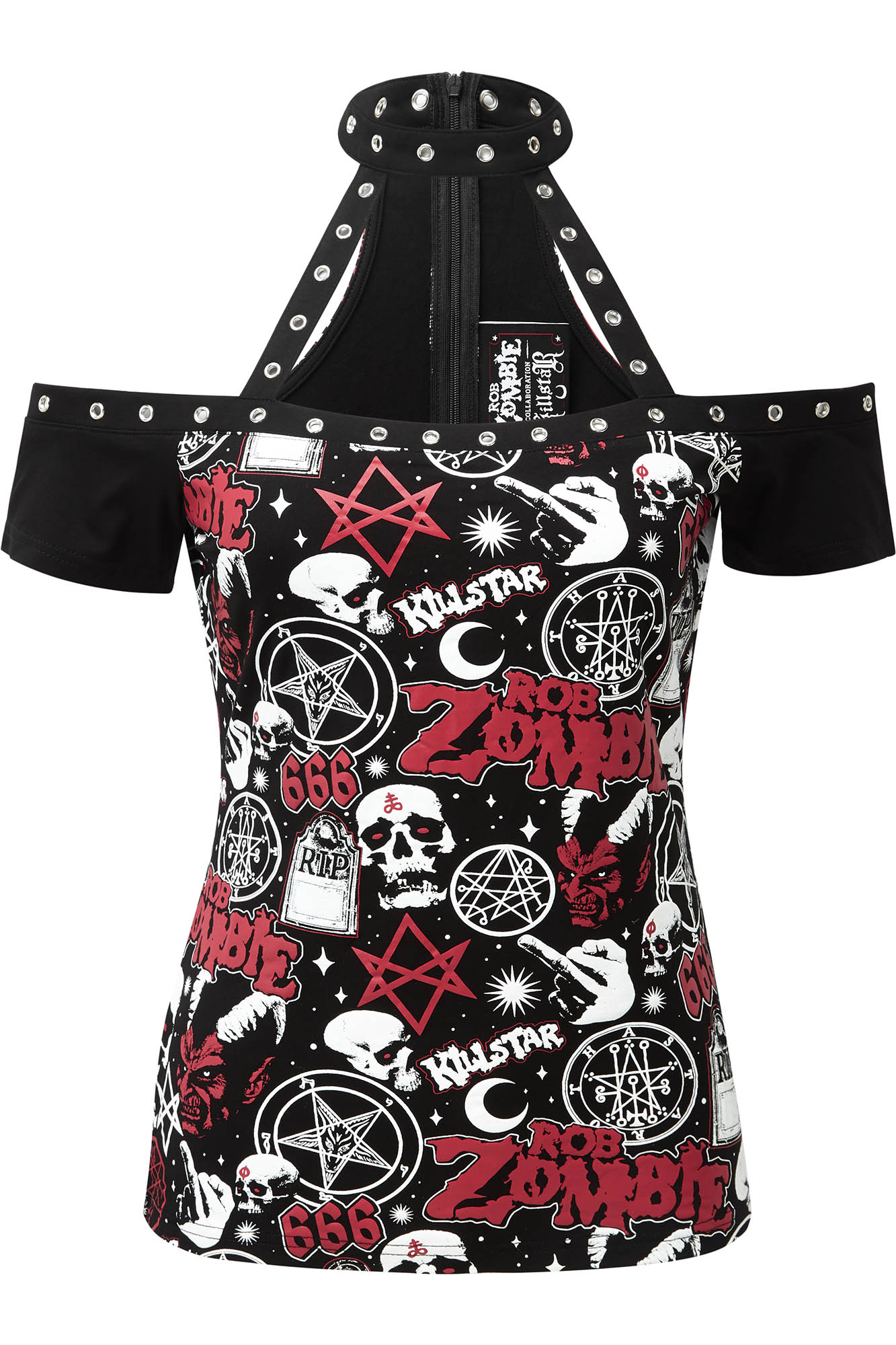 The 'American Nightmare' choker top is made of the softest stretch-jersey with a dramatic bardot neckline + choker; studded with silver eyelets and adorned with an all-over Rob Zombie print to front and back. Hidden zip to back for easy on/off. Easy to dress up or down depending on yer mood. Hell yeah!
