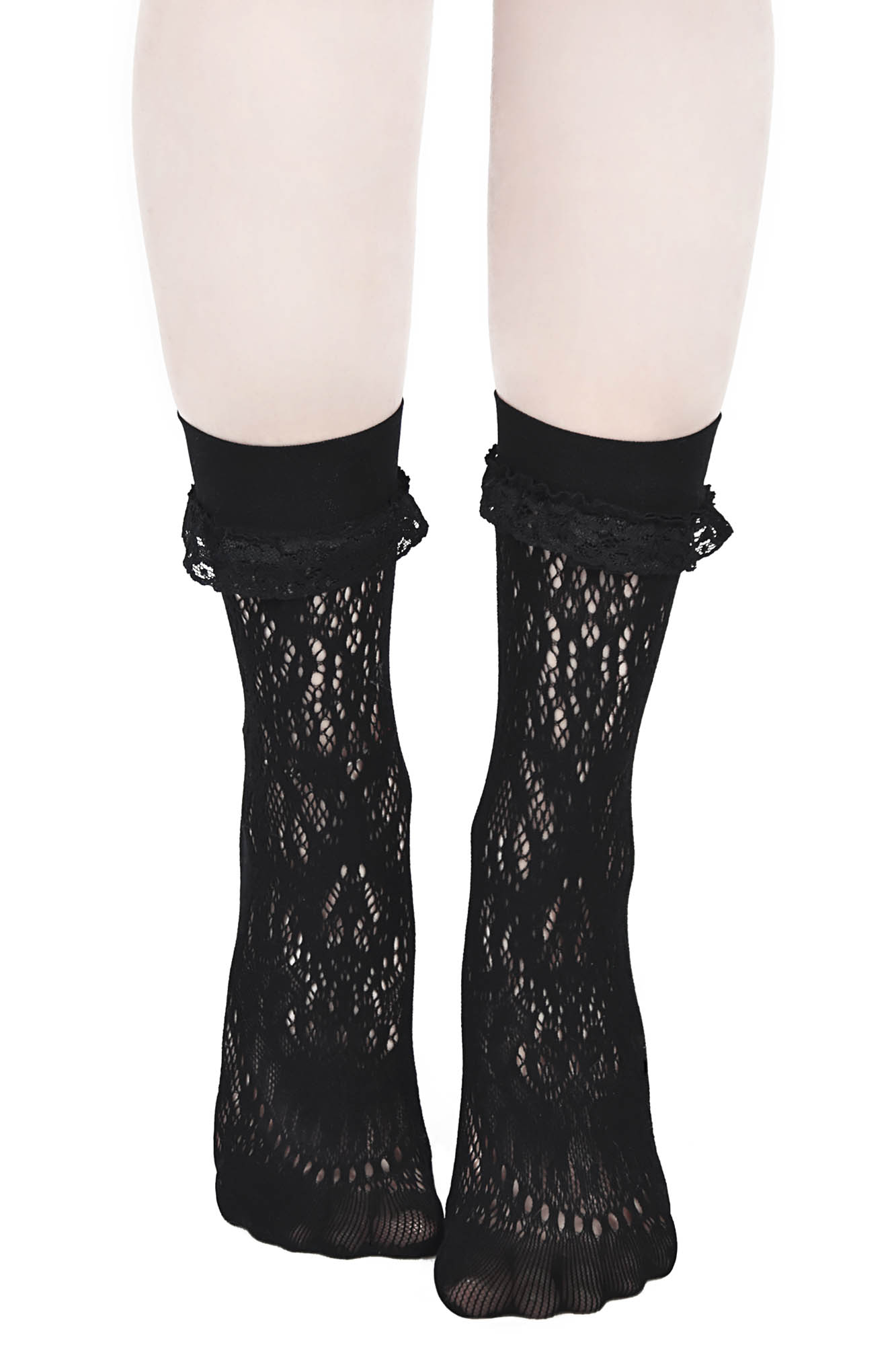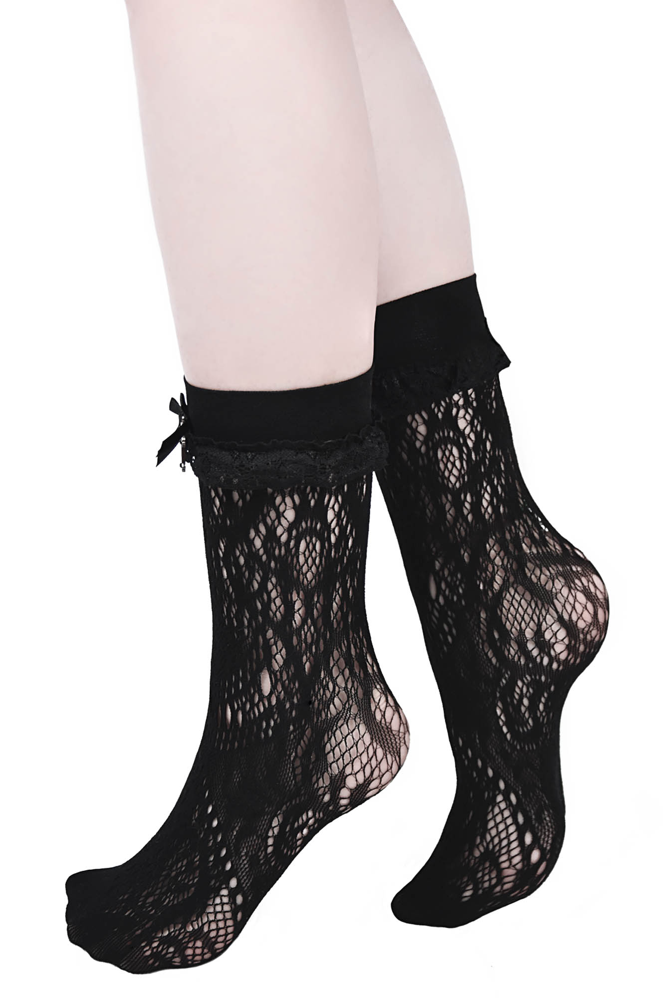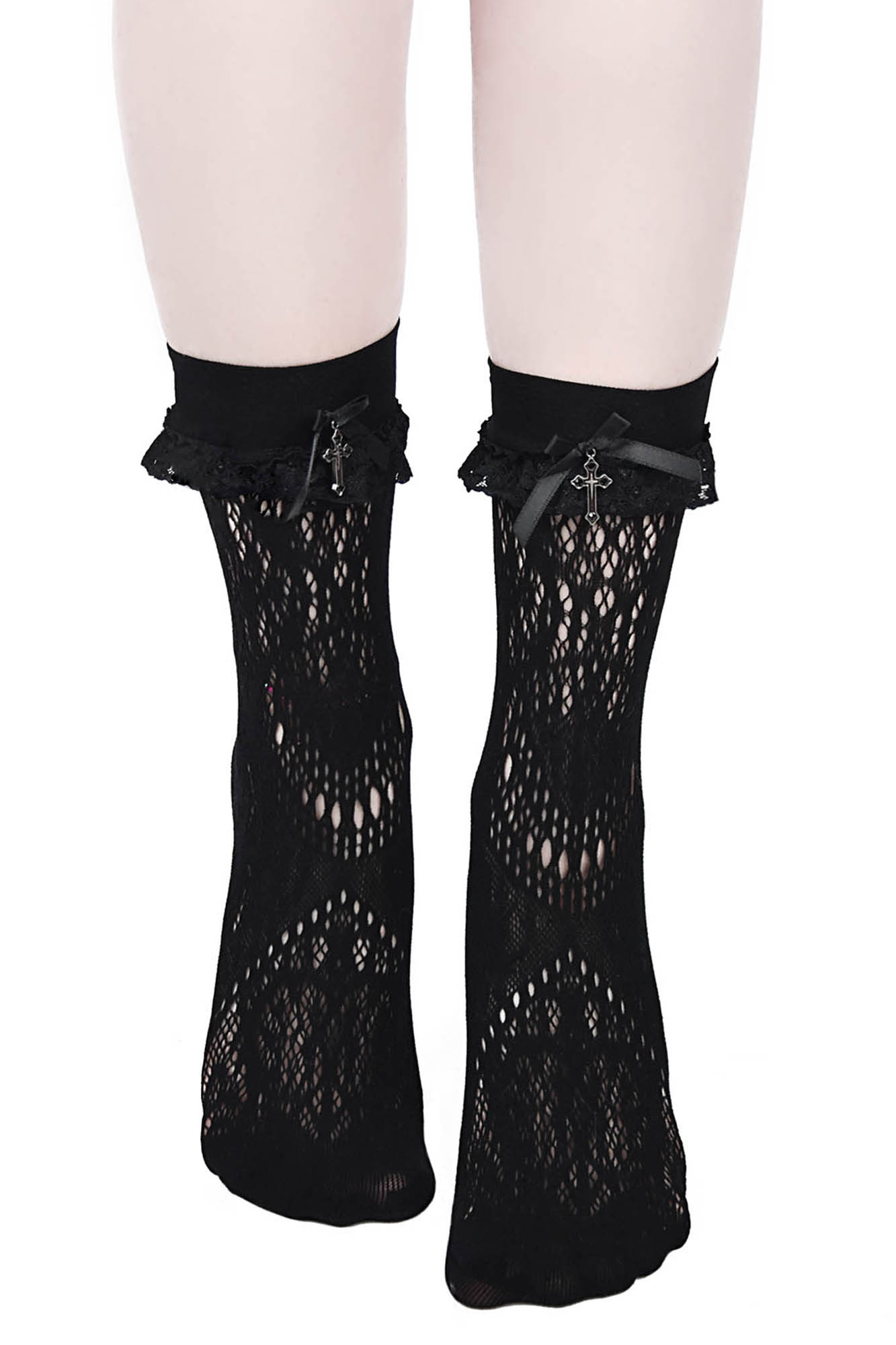 Wanna make yer footwear stand out even more? Or simply add a dash of romance to each and every step? The 'Amora' ankle socks are sure to please, silky smooth nylon-blend with just the right amount of detail, finished with a cute bow to the back with a statement cross charm. Dreamy!