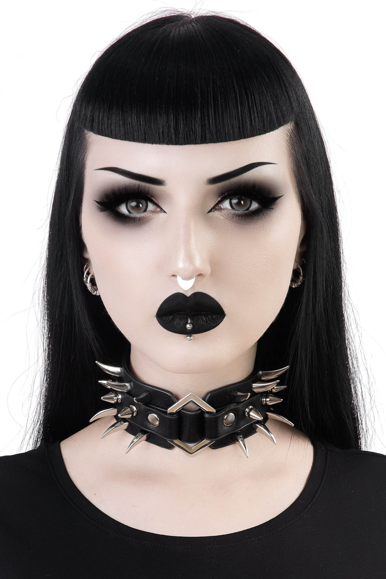 Step up your choker game with the enchanted 'Anastasia' choker; a faux leather body with dual strap construction, a mix of spikes and decorative hexagon shape to front. Complete with all hardware trims and fully adjustable for the perfect fit.