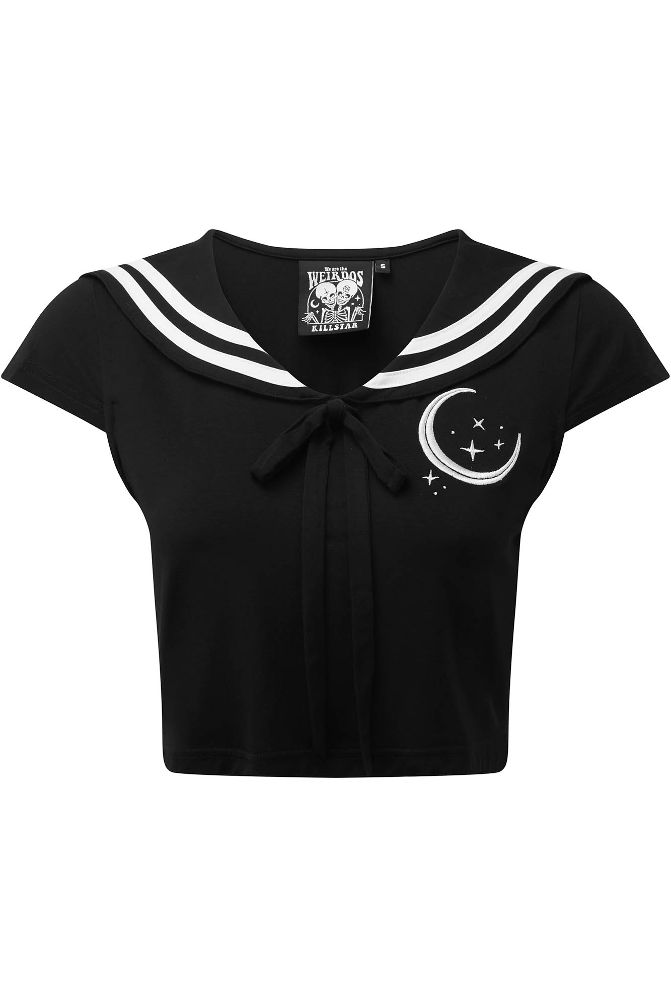 You are in my orbit but we are galaxies apart. The kawaii 'Anri' crop top; in a soft stretch-jersey - for ultimate comfort and fit. With statement sailor collar with contrasting stripes and moon embroidery. Decorative tie the front. Are you ready to sail to the stars?