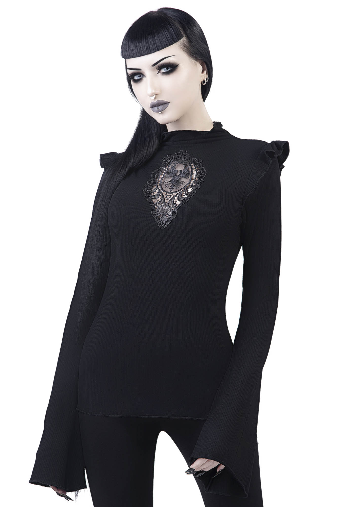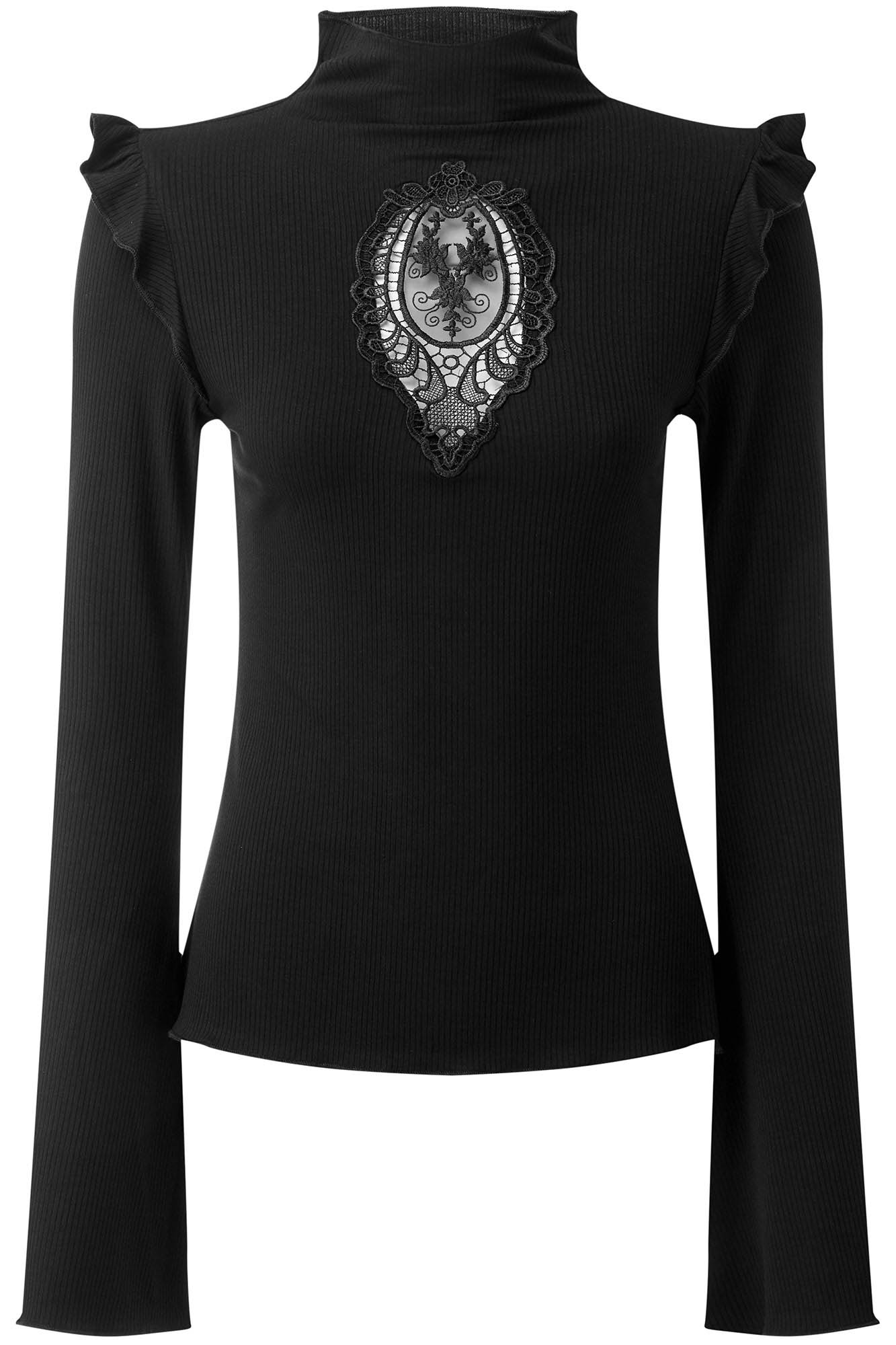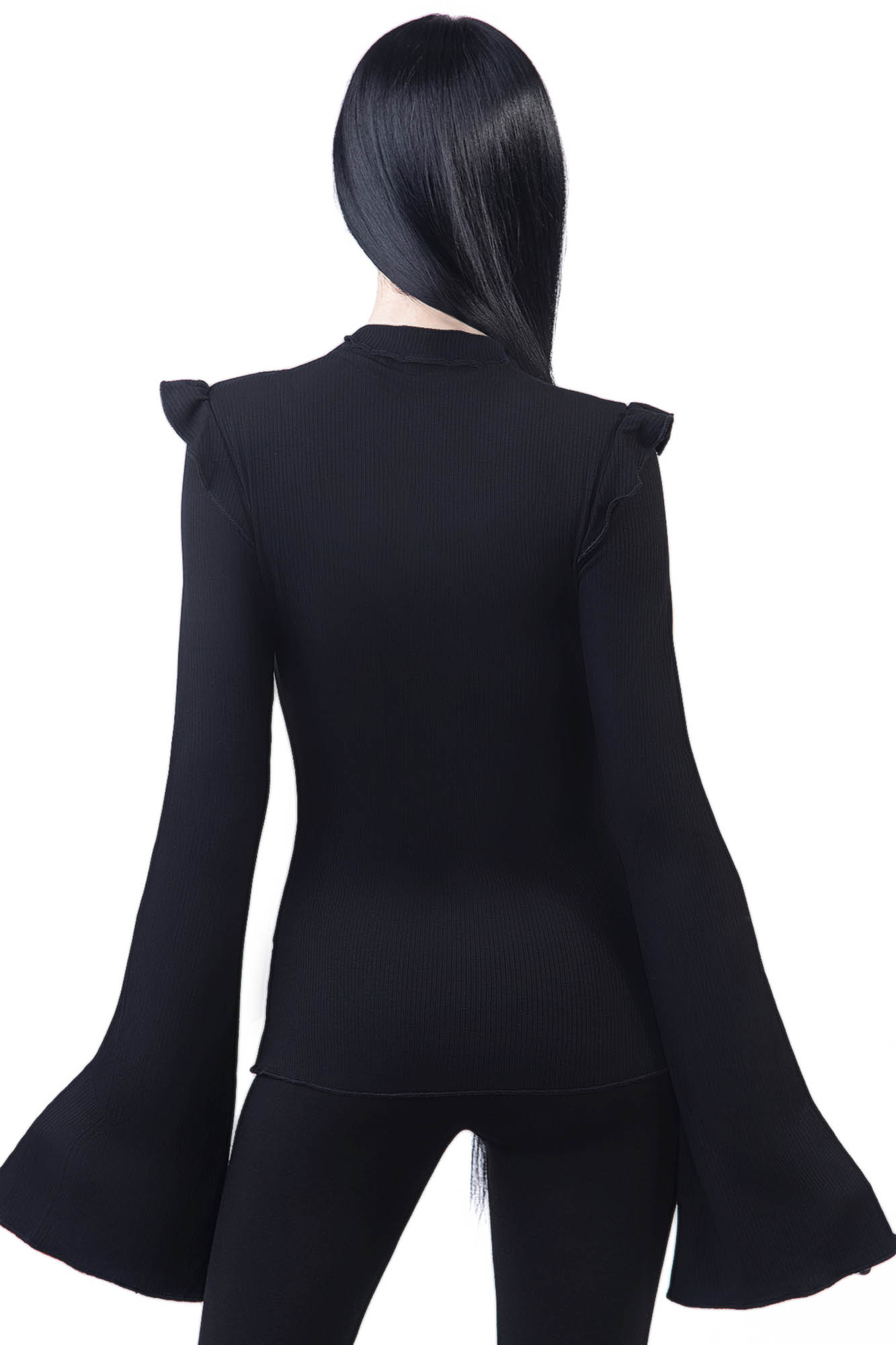 Be ready for any adventure in our 'Antonia' not-so-basic long sleeve top. Super soft ribbed-jersey with just the right amount of stretch, with high neck, cut-out with lace appliqué and ruffle accents. Extra long bell-sleeves. An essential piece - easy to wear and goes with anything!