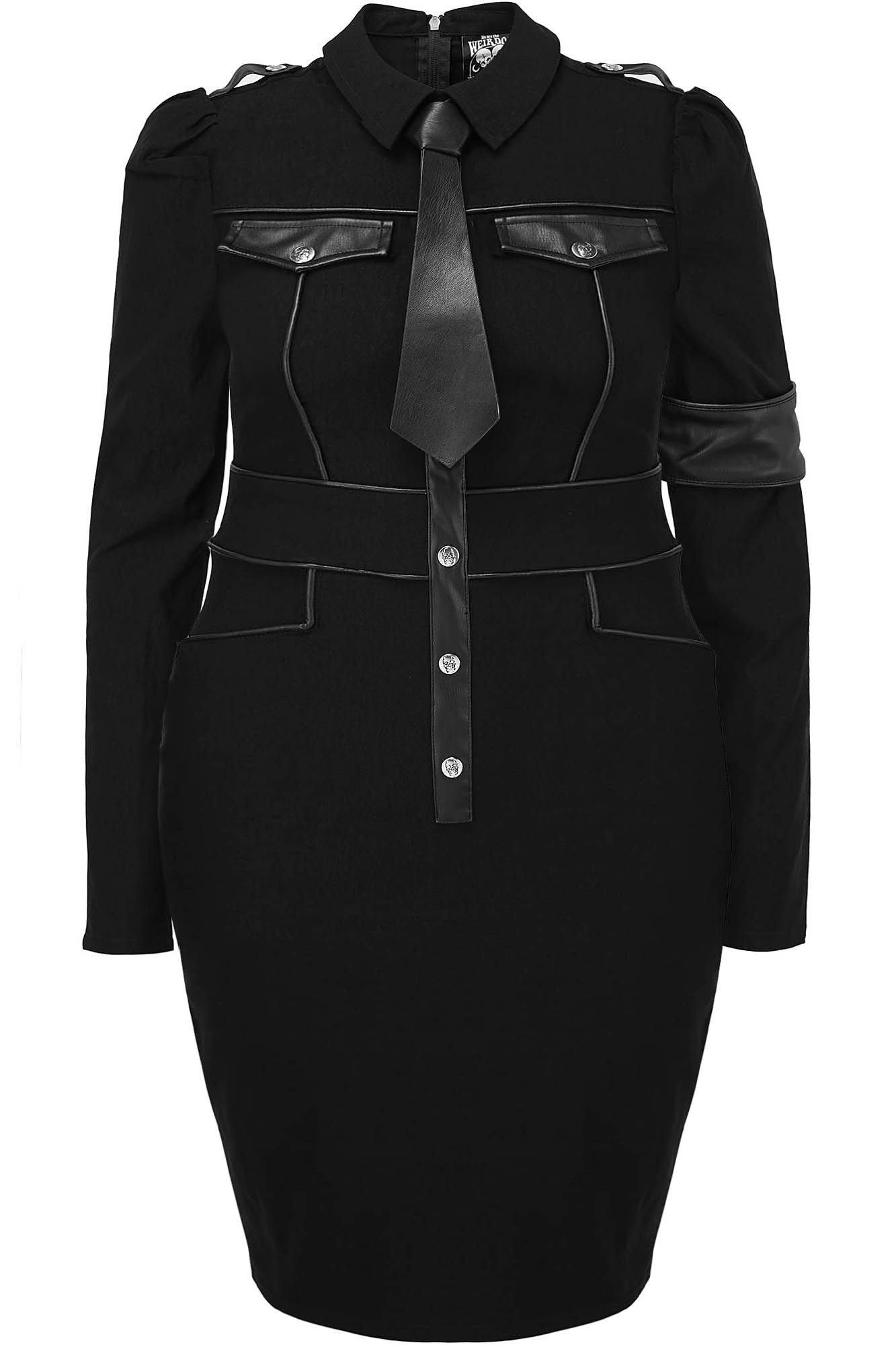 It's gettin' real hot up in here with the 'Army Of Darkness' dress; featuring a super-stretch woven fabric for a flattering + comfortable fit, guaranteed to keep heads rollin' when yer out! With a complimentary silhouette, this midi-length statement piece has folded collar with optional faux-leather tie, decorative buttons + pockets, and contrast-binding. With long puff sleeve, armband detail and zip to the back for easy on/off! Perfect for nights out, hangin' with the demon legions or just adventures up and beyond!