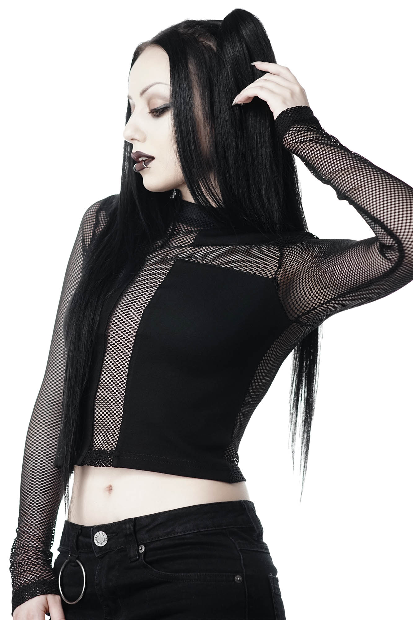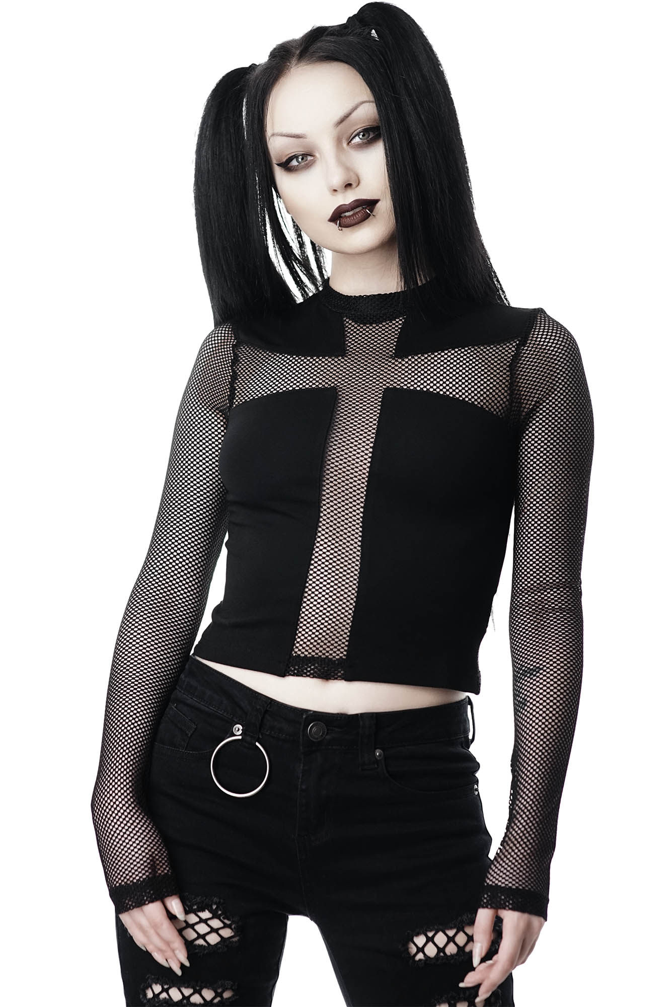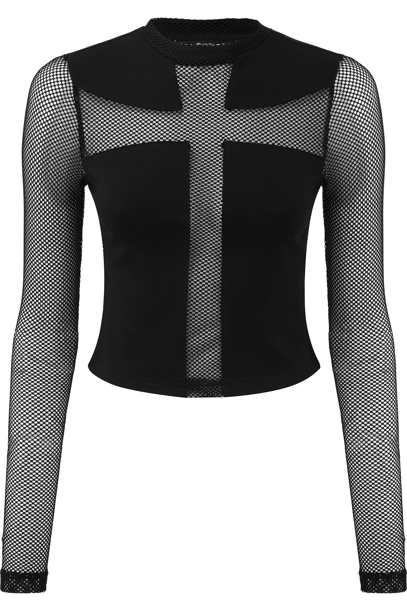 Life is a grave, dig it! The 'Arsenic' long sleeve top is composed of super-soft fishnet with a statement cross modesty panel to the front. With a round neck and slightly cropped body - easy to wear and very versatile.