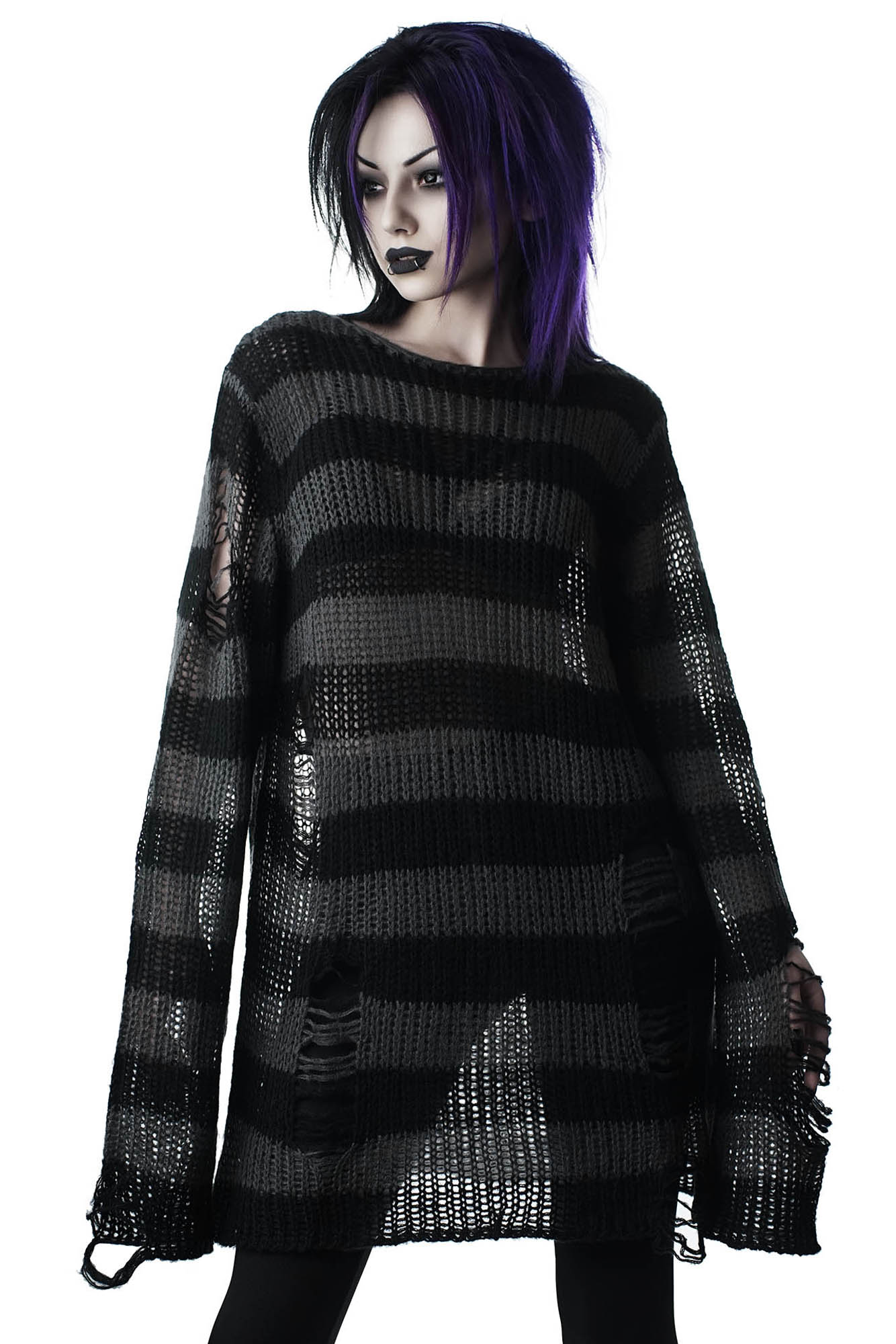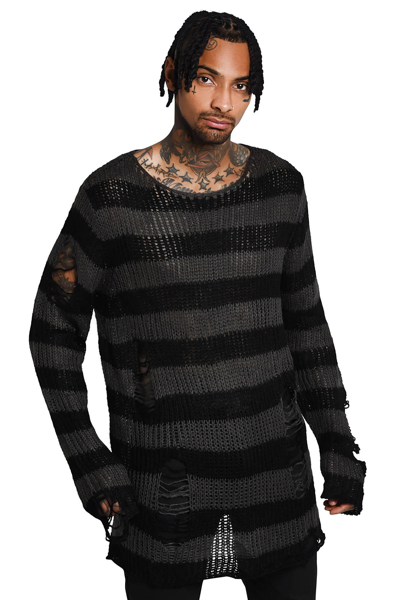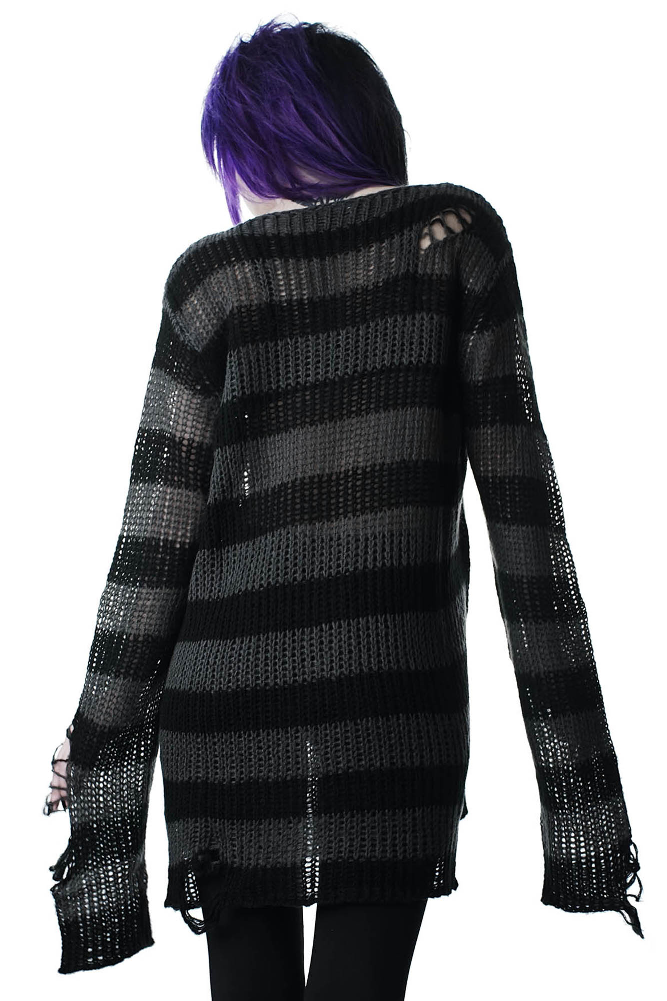 Channeling some 90s grunge with the 'Ash' soft-knit sweater, perfect for layering - or wear as a statement piece. Contrasting black and grey striped body; with extra long length so can easily be dressed up or down. With distress detailing and low neckline. Ideal for cozy fashion, midnight promenades with the moon and hungover Sundays.