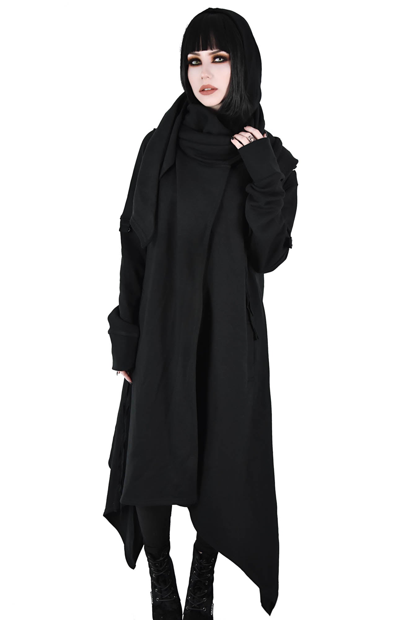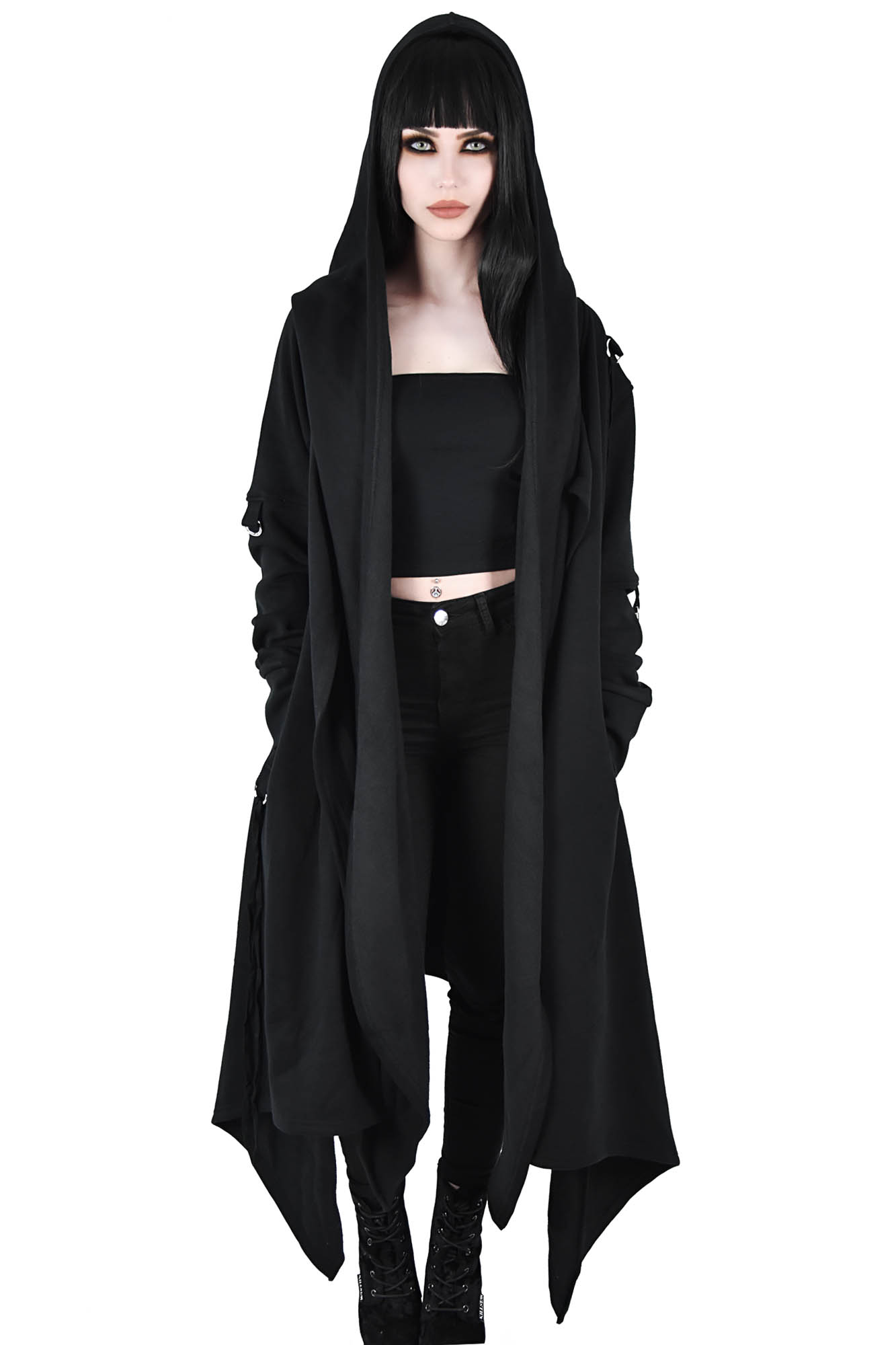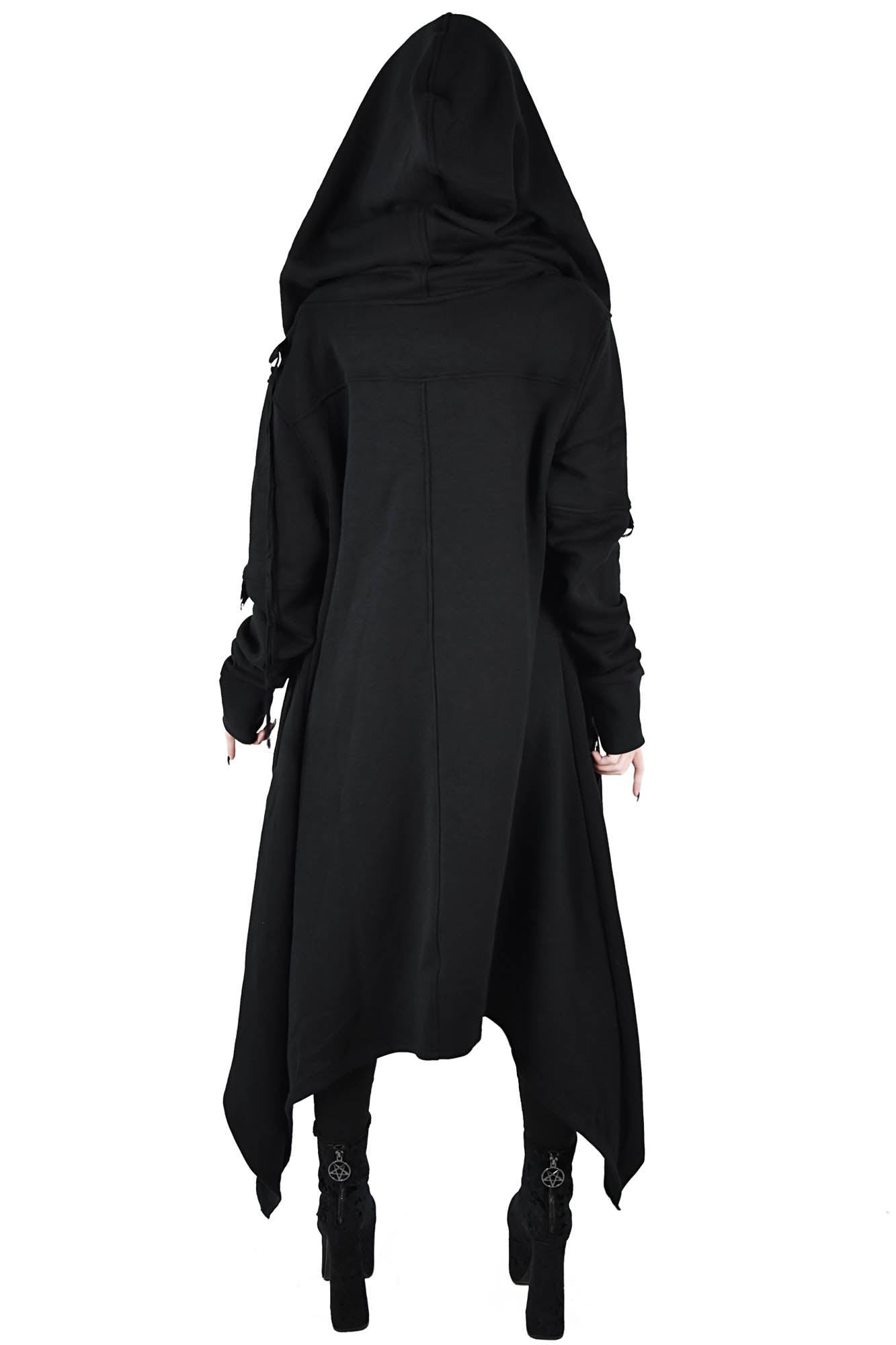 By the grace of the devil we give you this versatile and oh-so[ul]-lustful jersey cardigan; 'Assassins' is a dark layering piece with an oversized hood, draping + long length front, uneven hems and D-ring details to sleeves - complete with thumbholes. Yer ready for your midnight calls, dark baptisms or just plain old chill/thrill/kill - a guaranteed head-turner!