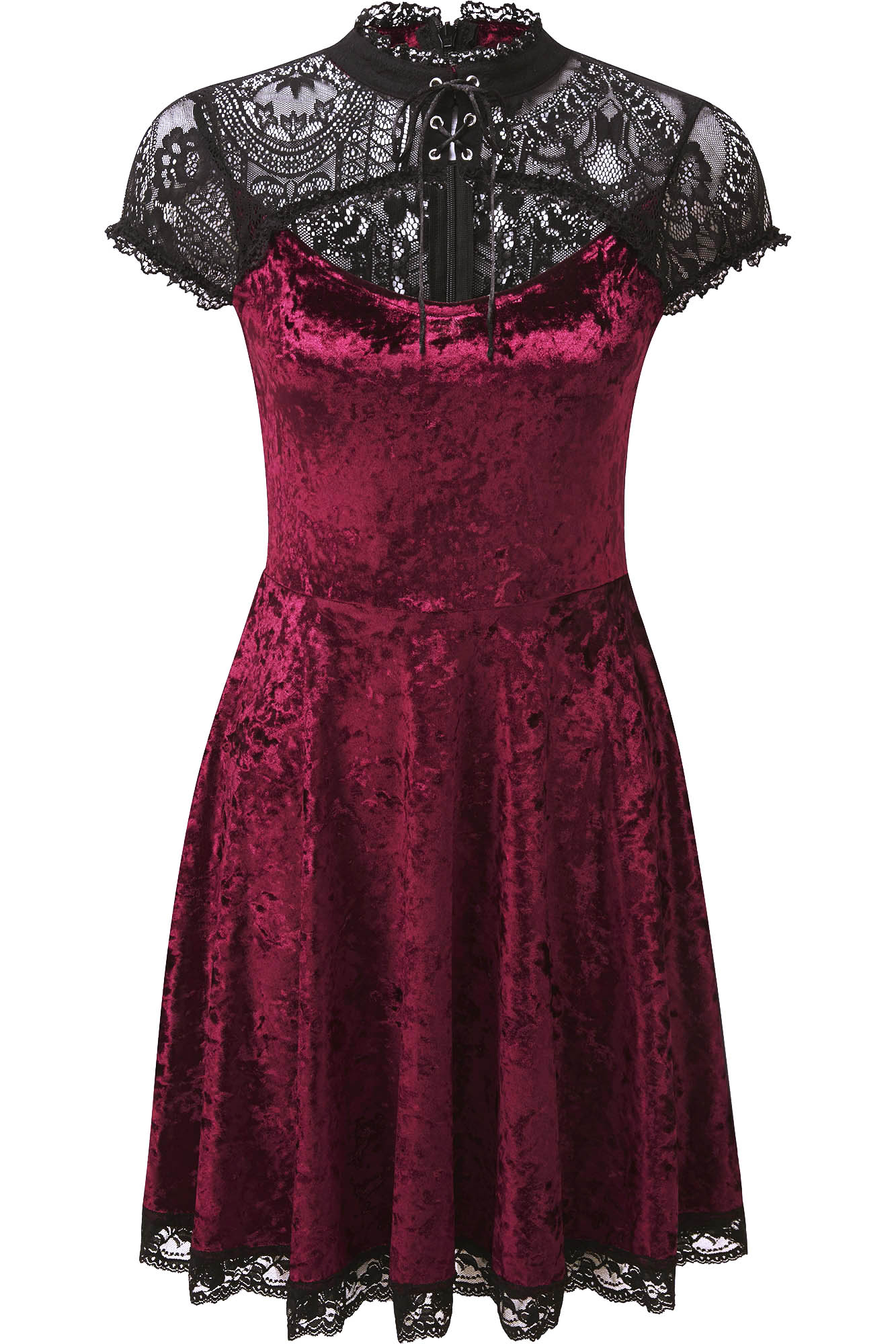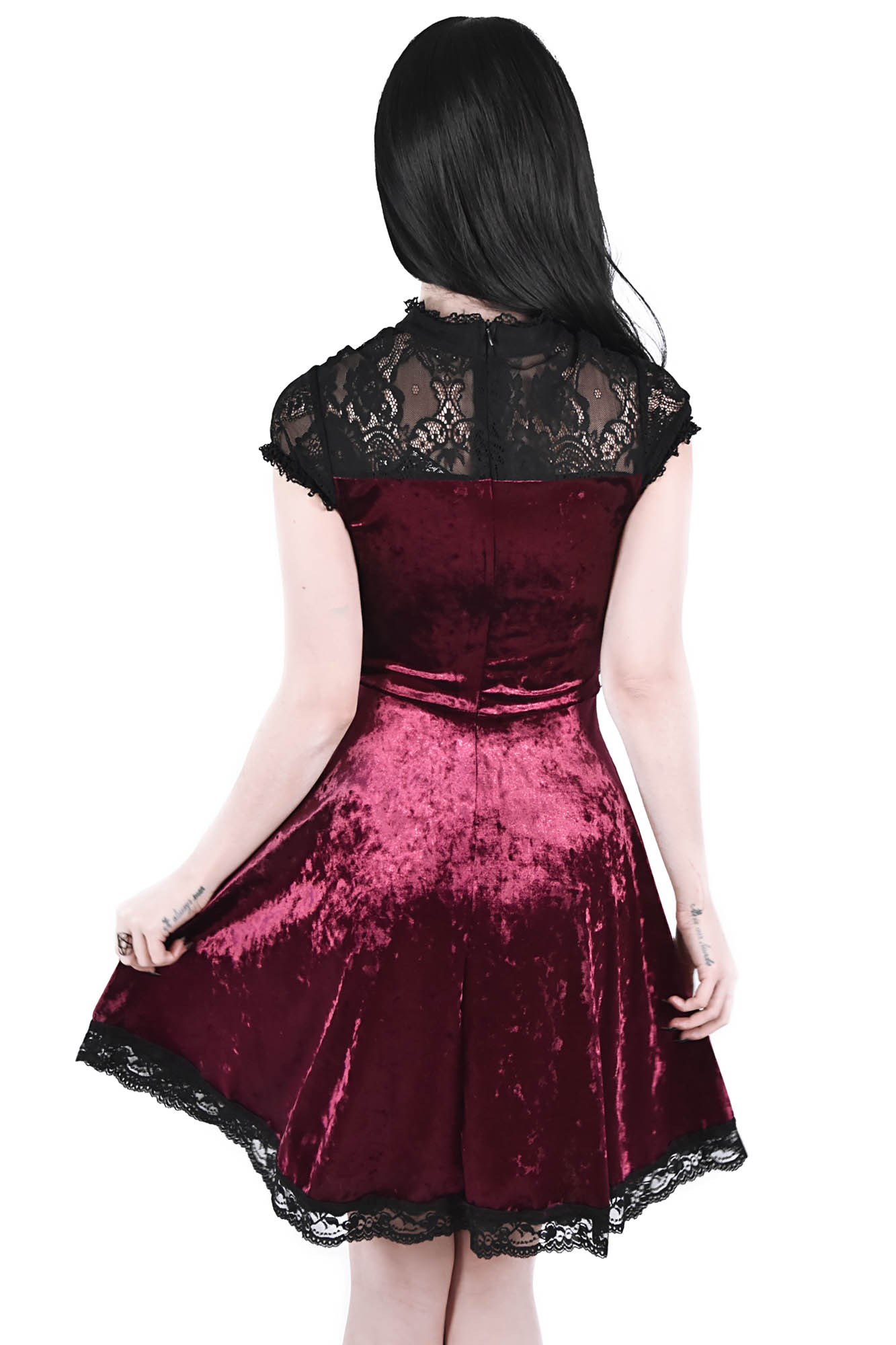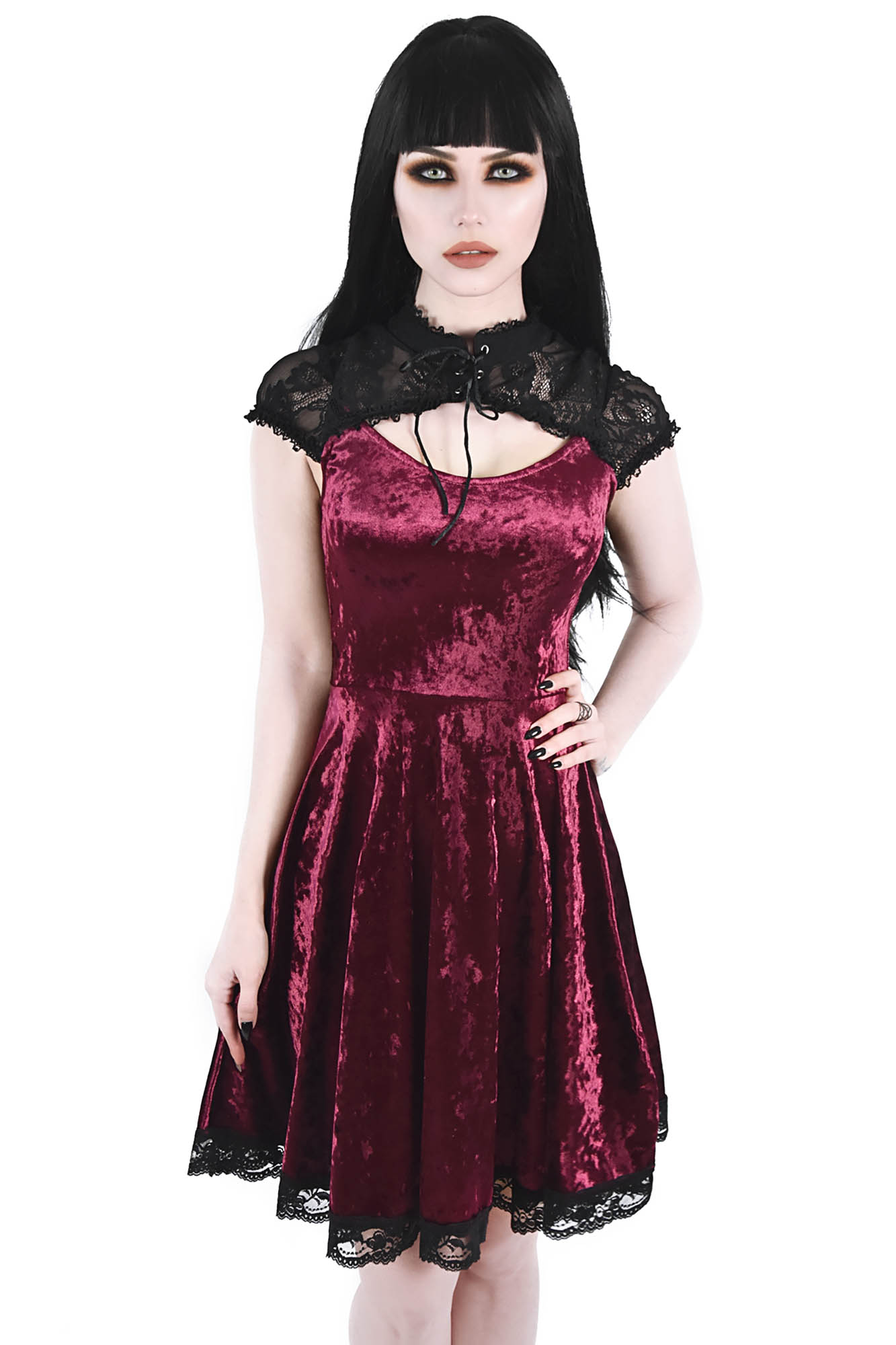 Cute and versatile crushed velvet - the 'Astephana' skater dress gives you a perfect statement look whilst keeping comfortable with a flattering fit. A beautiful lace yoke with high neck and tie-front, keyhole to the chest and delicate lace trims to all hems. Zip on the back for easy on/off. An easy go-to piece for dusk or dawn, purrfect for the ghouls and vamps alike.
