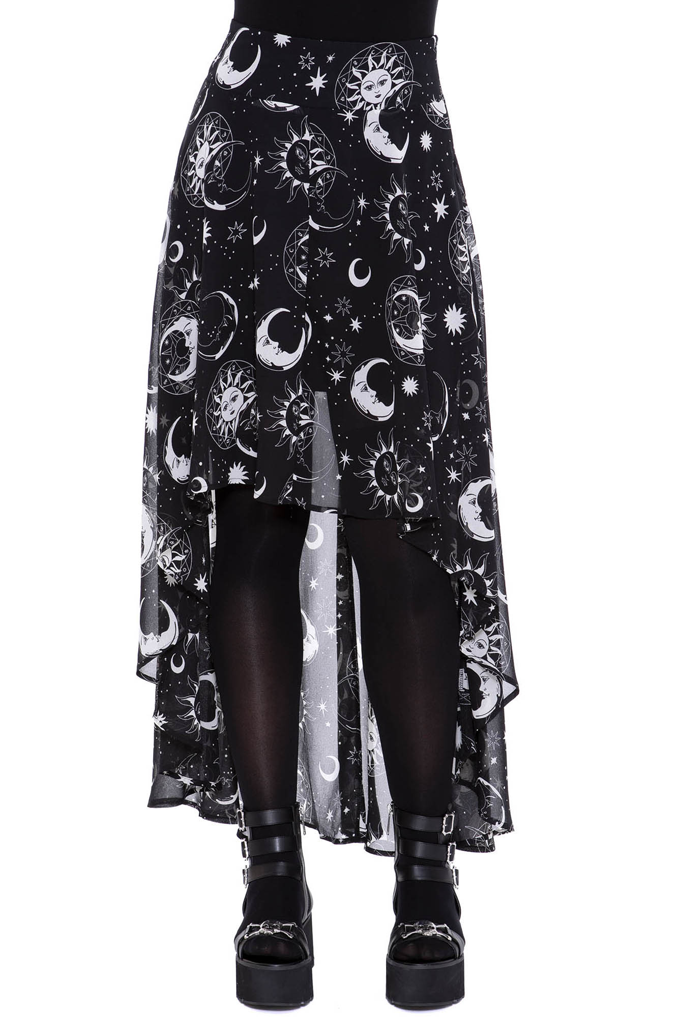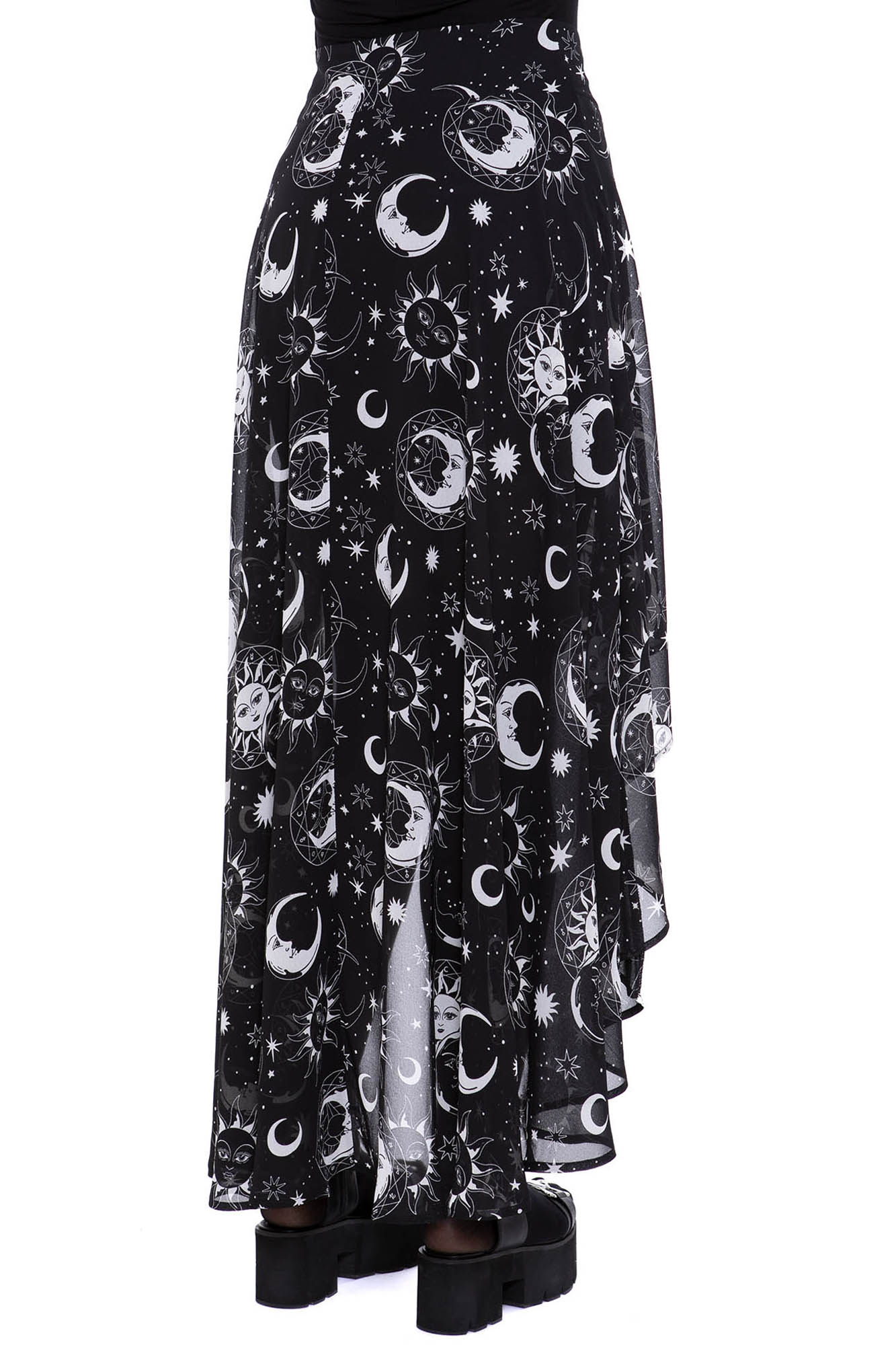 Add some cosmic glamour mixed with midnight delight; the 'Astral Light' maxi skirt is a perfect statement piece - cascading soft chiffon with a fishtail back and fitted waist with zip closure. Decorated with a beautiful statement graphic of vintage suns and moon. Simplicity mixed with the perfect balance of decadence - will help charge you with some magical flow.