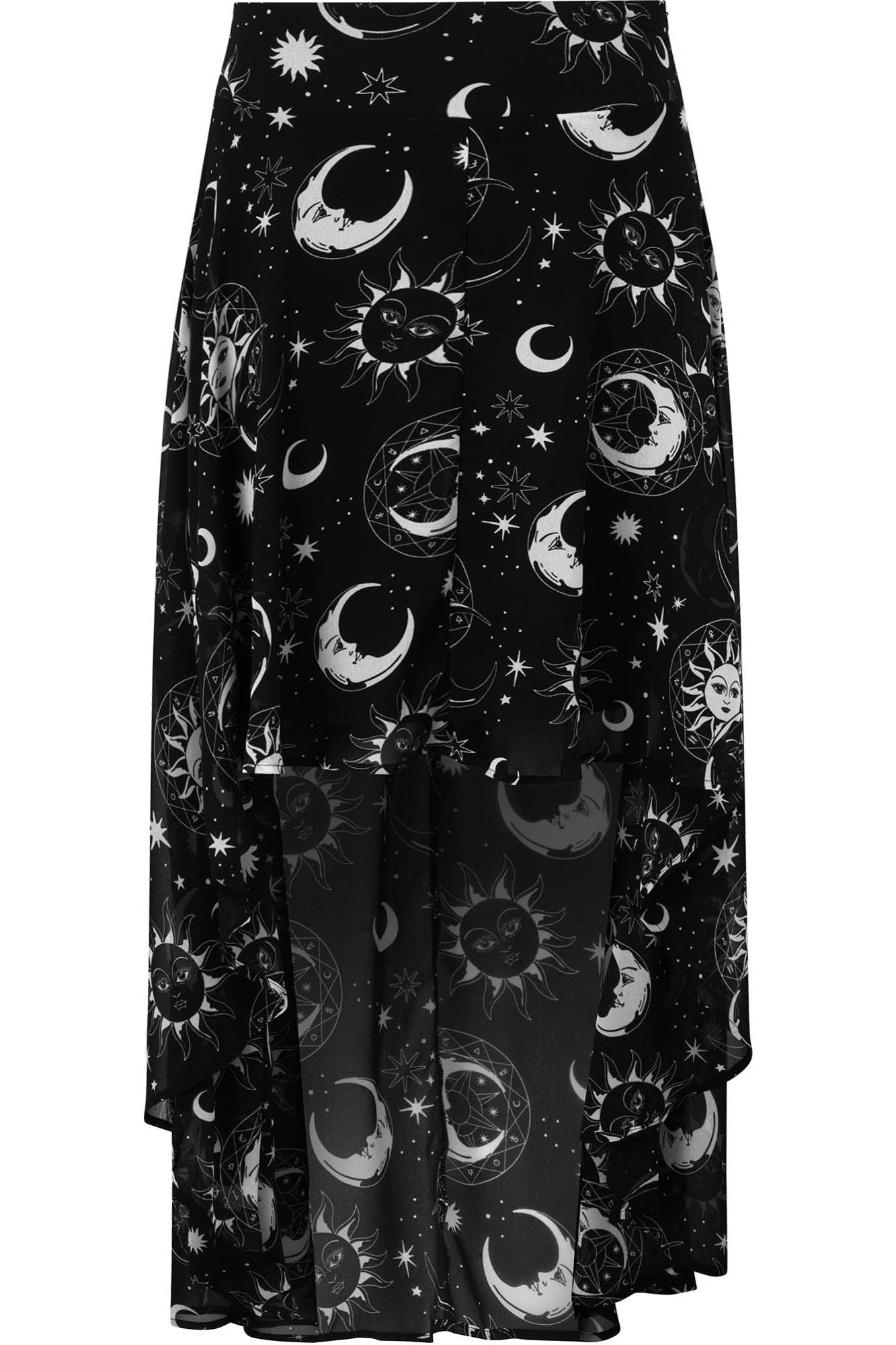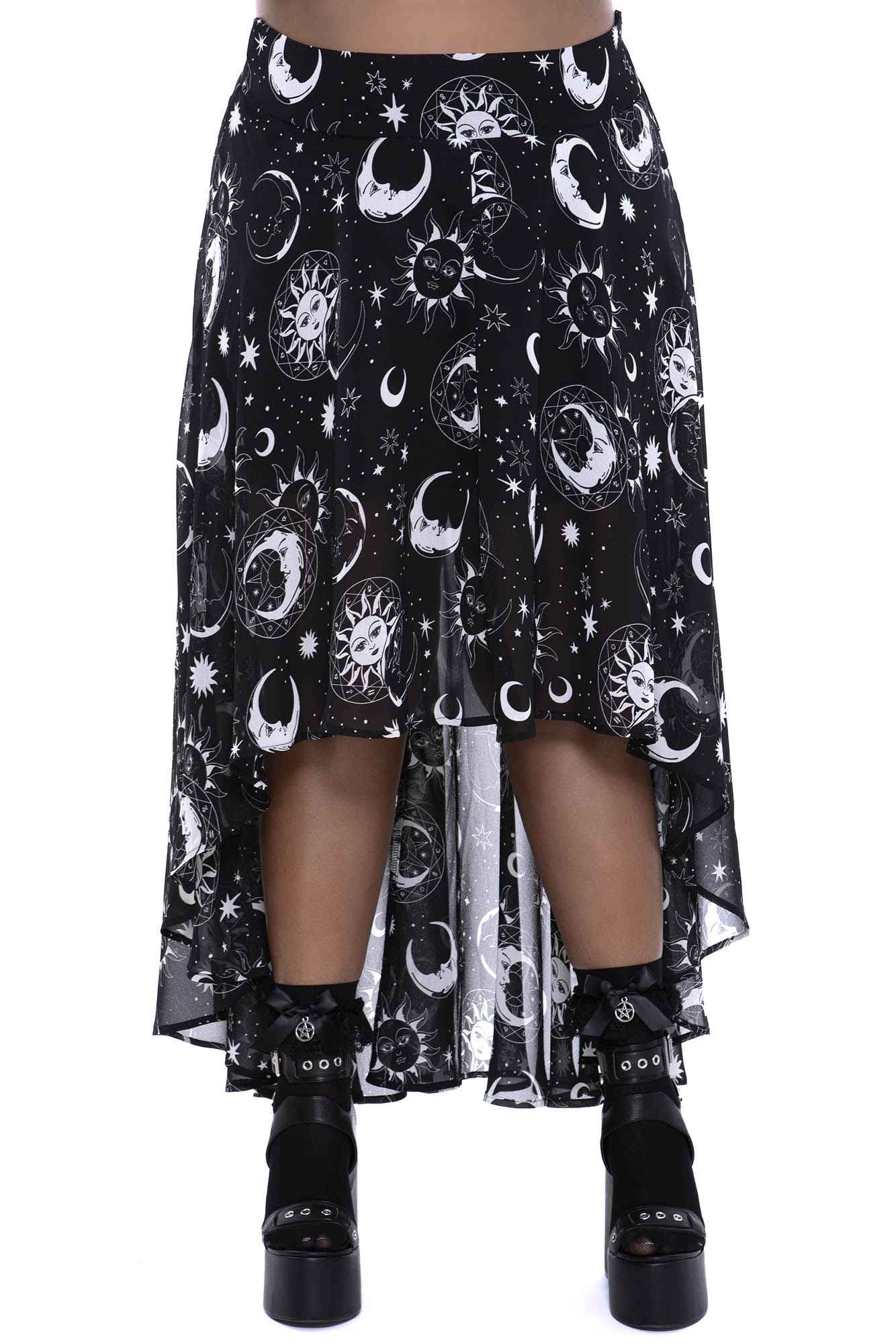 Add some cosmic glamour mixed with midnight delight; the 'Astral Light' maxi skirt is a perfect statement piece - cascading soft chiffon with a fishtail back and fitted waist with zip closure. Decorated with a beautiful statement graphic of vintage suns and moon. Simplicity mixed with the perfect balance of decadence - will help charge you with some magical flow.