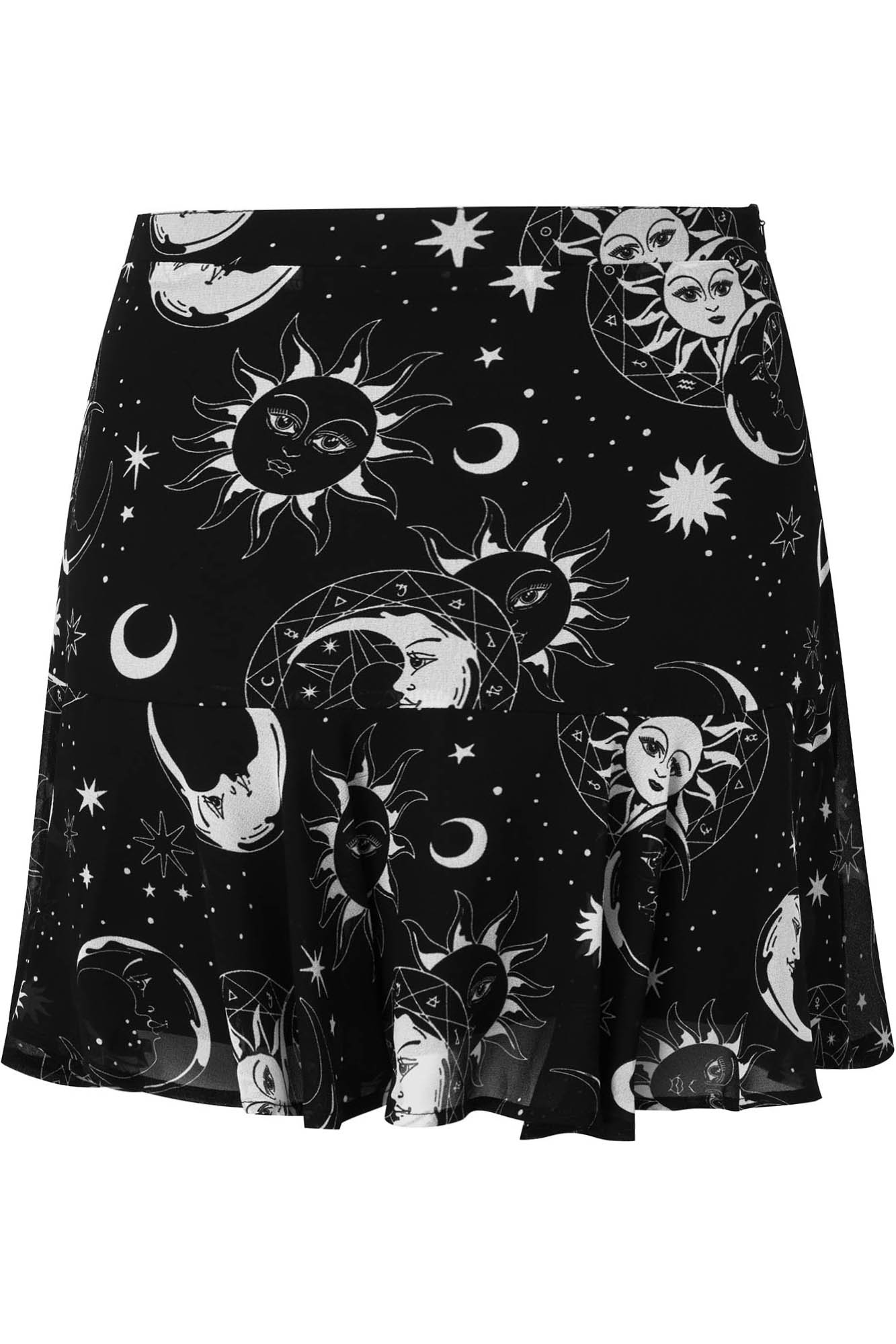 Add some cosmic glamour mixed with midnight delight; the 'Astral Light' skater skirt is a perfect statement piece - flowy and soft-chiffon body with a fitted waist and zip closure. Decorated with a beautiful statement graphic of vintage suns and moon. A perfect versatile core piece that is easy to style up or down depending on your mood/moon!