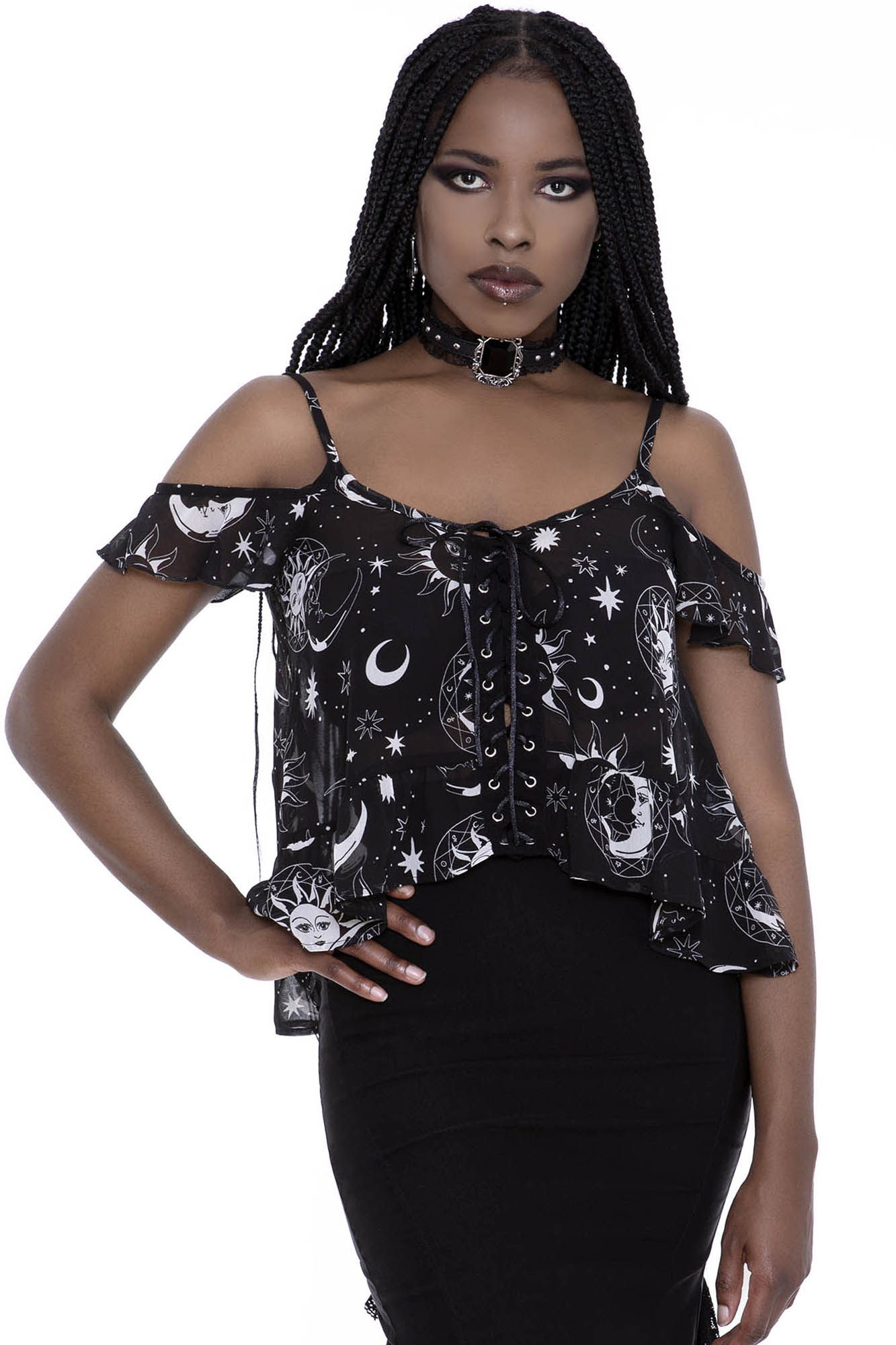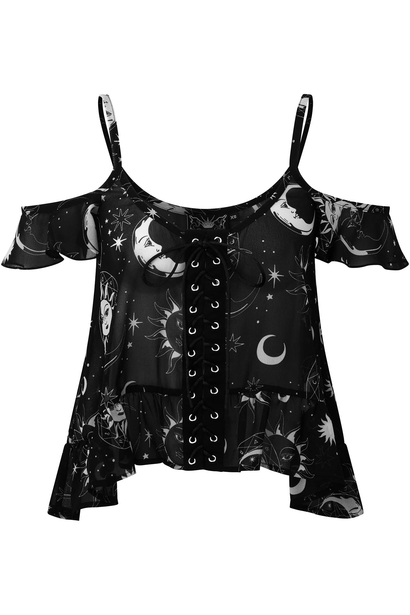 Defy the heat and allow yer heart to beat; the 'Astral Light' chiffon top is just the saviour you need for hot nights/days. Super feminine with lush soft fabric, low neckline, and thin straps, statement corset-lace front and decorated with a beautiful statement graphic of vintage suns & moons. Simplicity mixed with a perfect balance of decadence - will charge you with an instant magical flow.