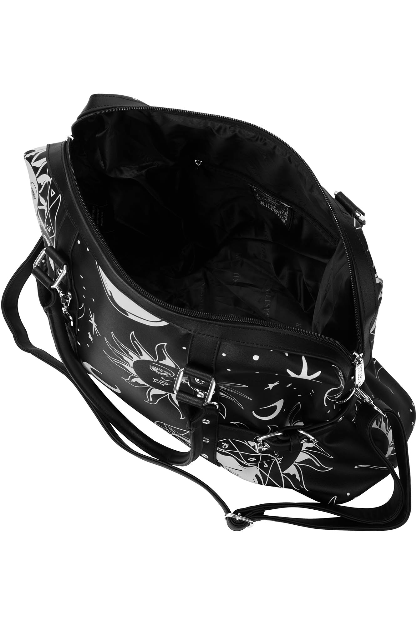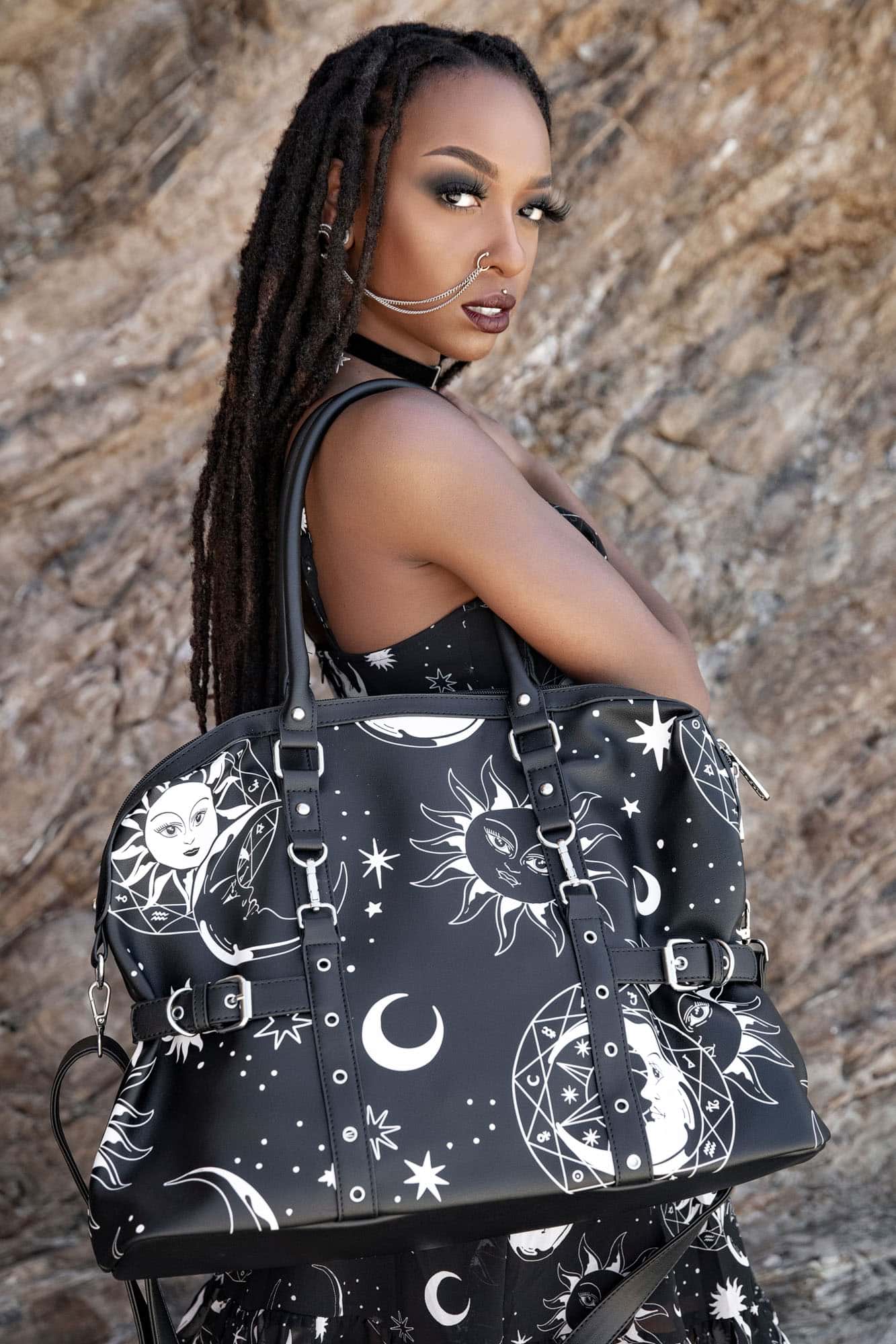 Going somewhere for a day or a year, or a moment or a life - the path to the cosmos is bright. The 'Astral Light' weekend bag is made with love for every detail; faux leather decorated with contrasting graphic, harness accent body and zip closure, inside pocket and long adjustable [and detachable] shoulder strap - and of course - fully lined. Perfect for weekends away, coven meet-ups or simply bringing a piece of the crypt with u on the road...