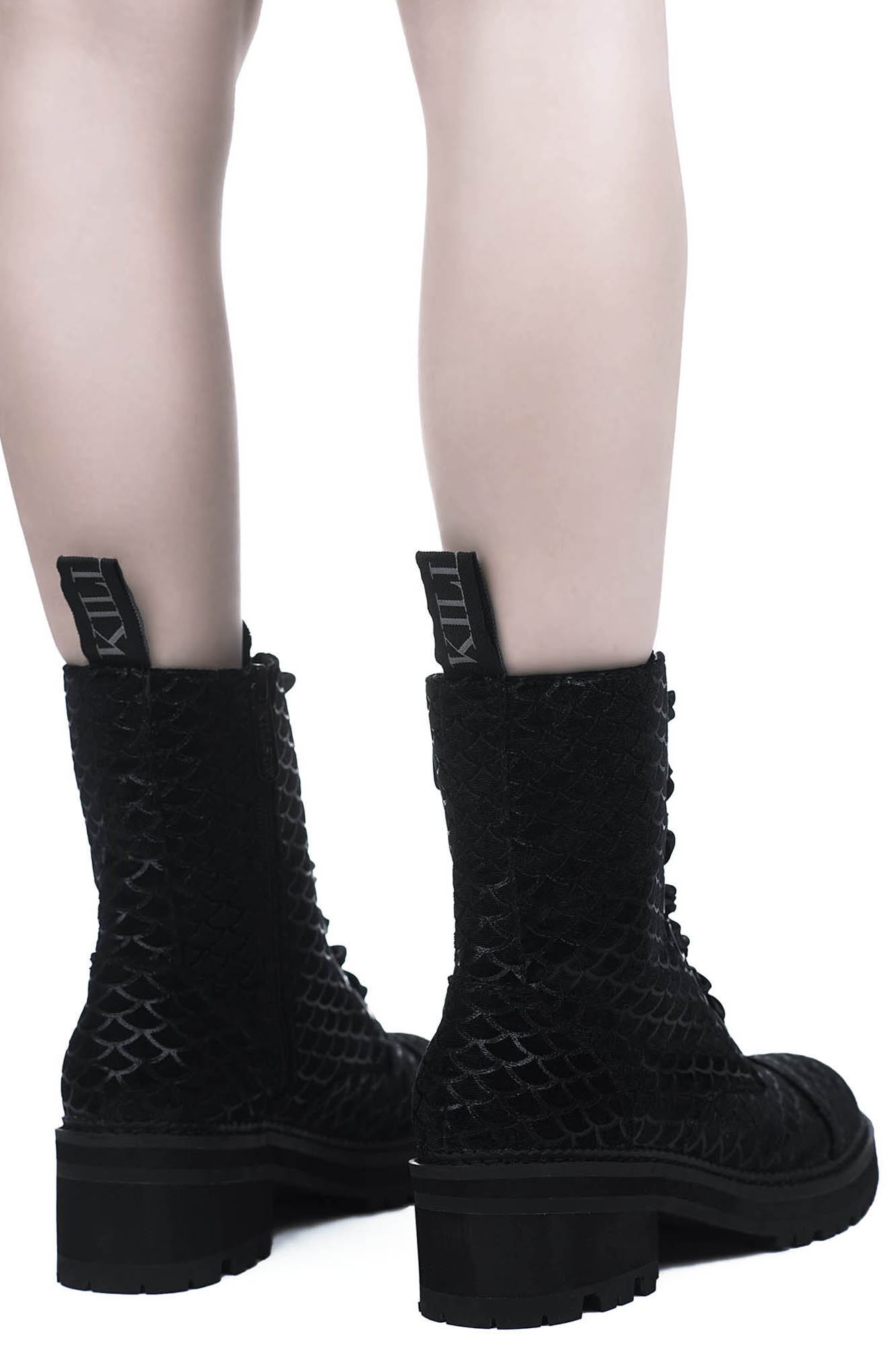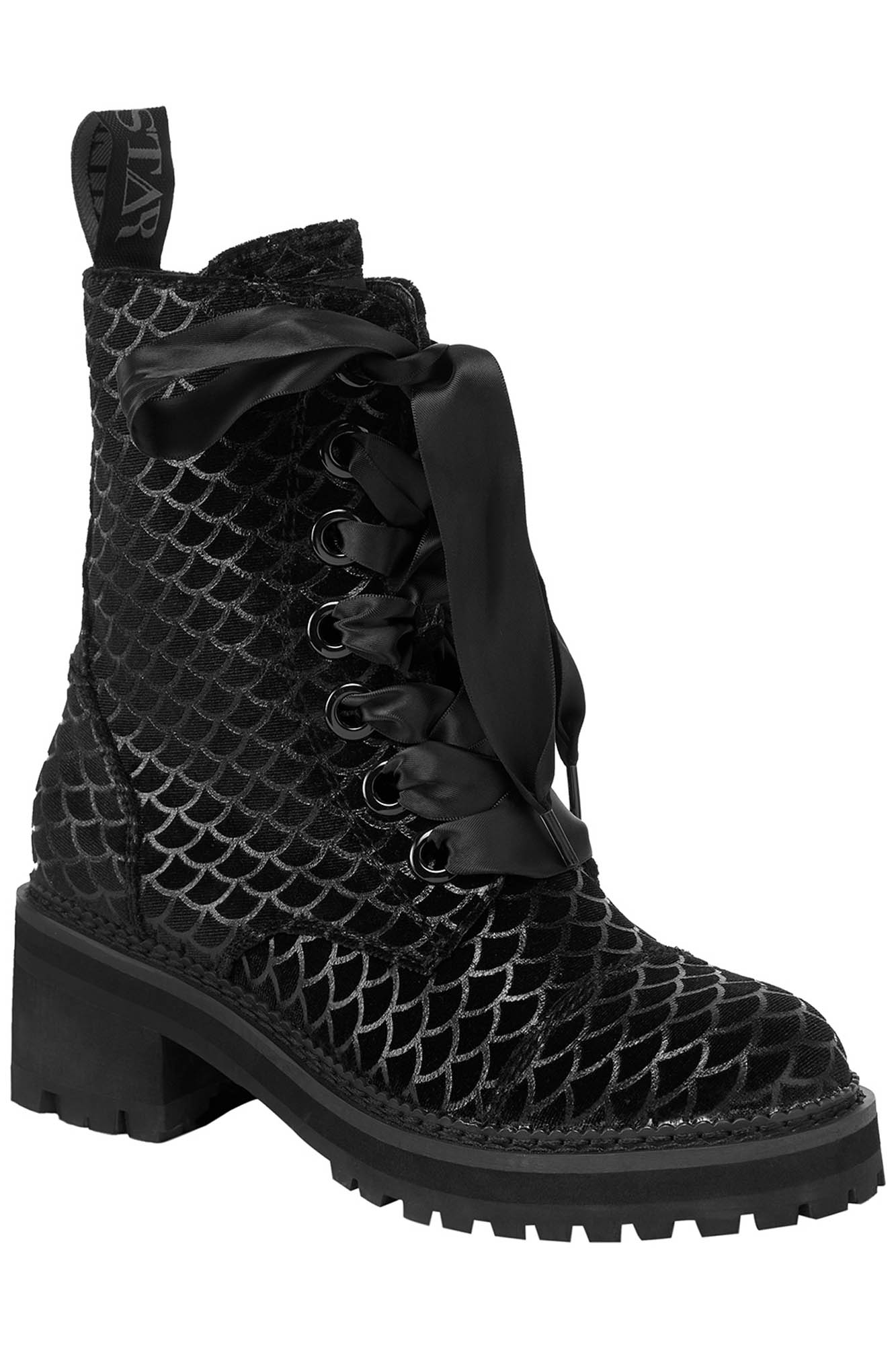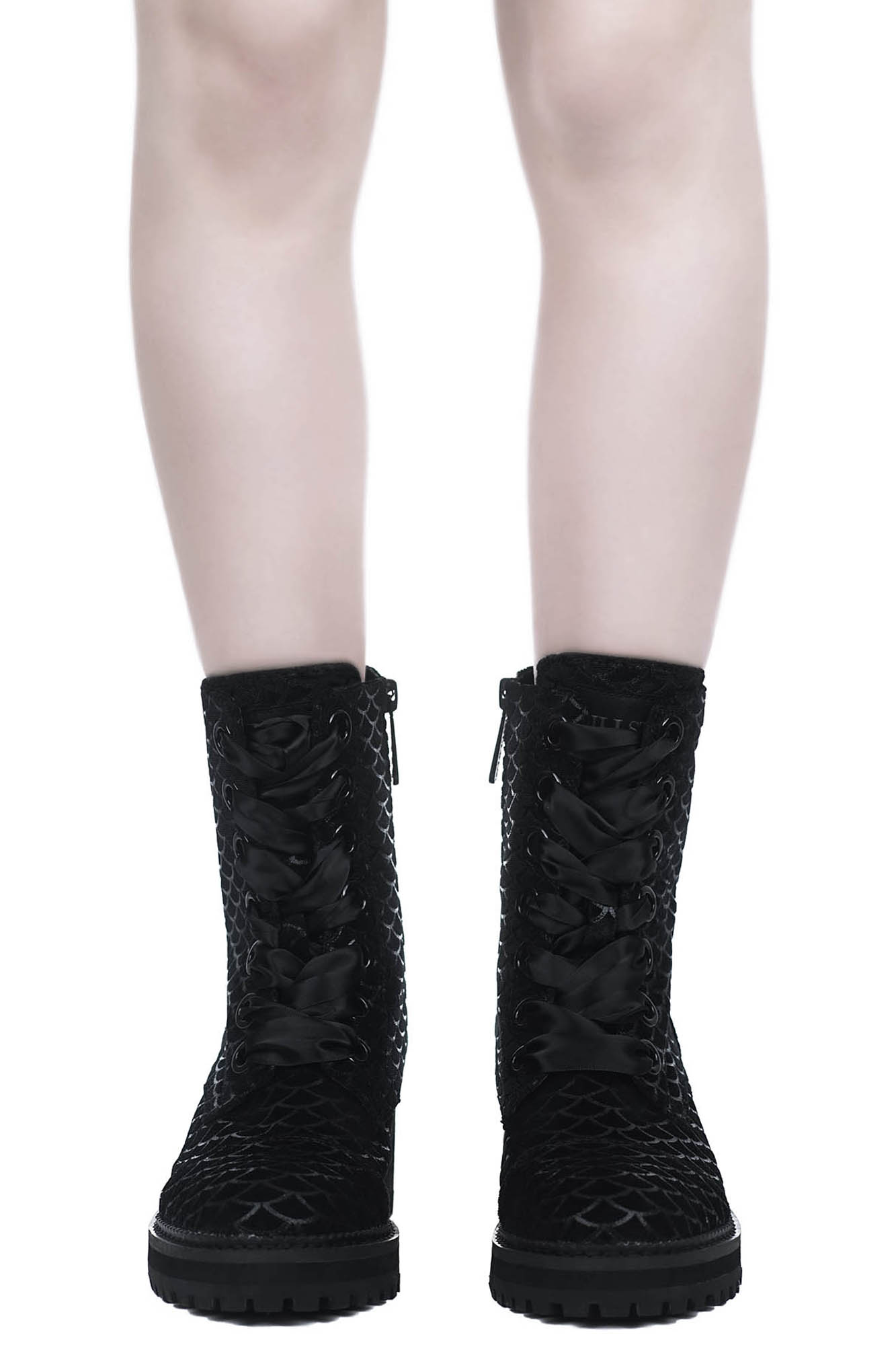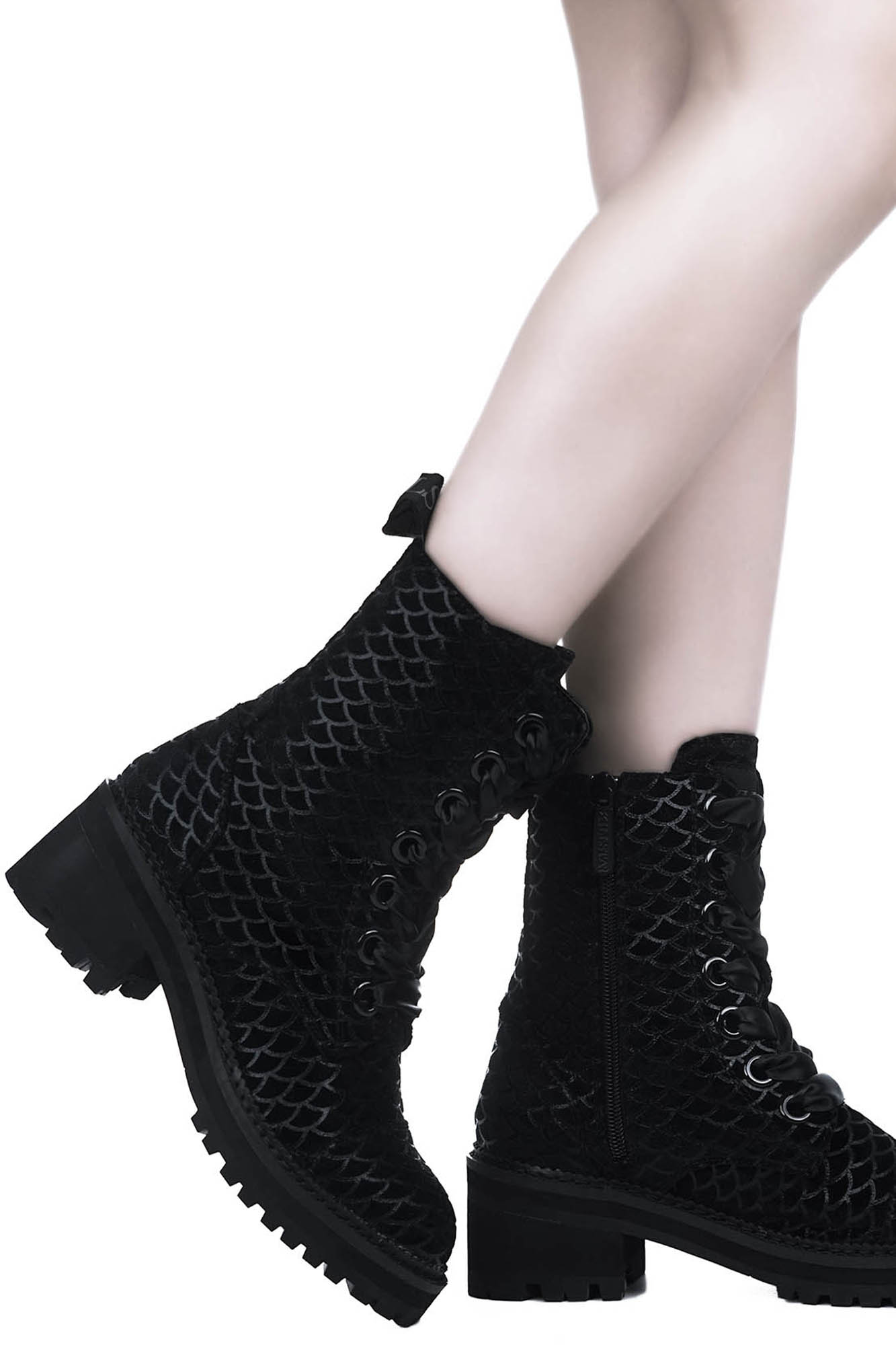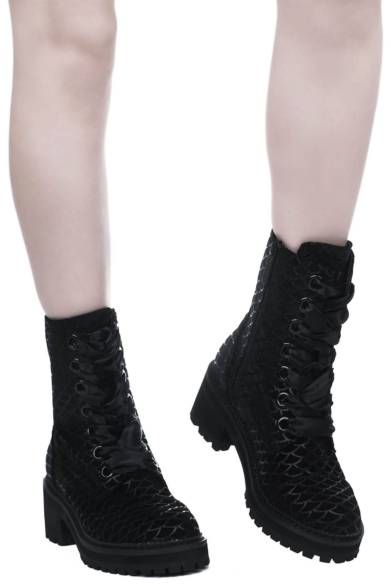 Dancing in the forest to your own melody or just hanging out with the witches - these combat boots are made for any mood! 'Atlantis' super versatile boots in lush velvet and faux leather [all black of course], classic shape with wide satin laces to front, side zip for easy on/off and slightly elevated with a 2" heel. A black-on-black beautiful mermaid scale pattern decorates the full body - and even the hardware is black; just like your soul!