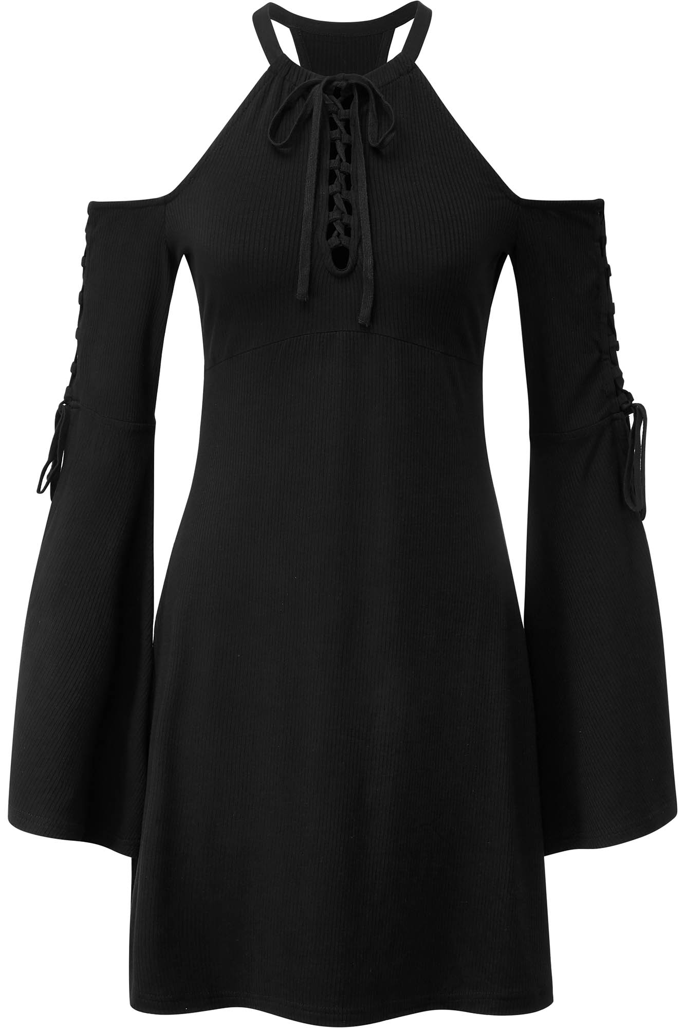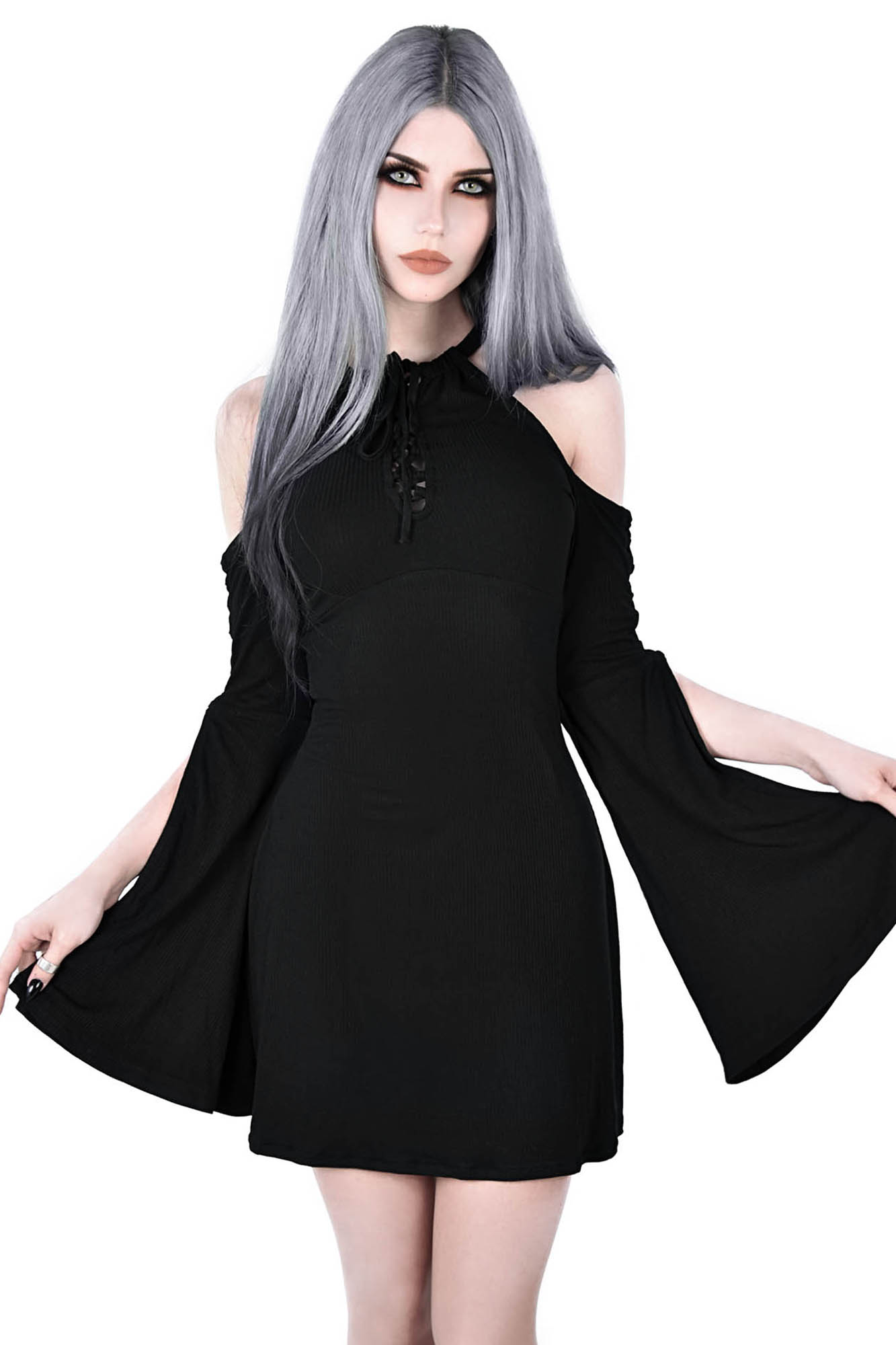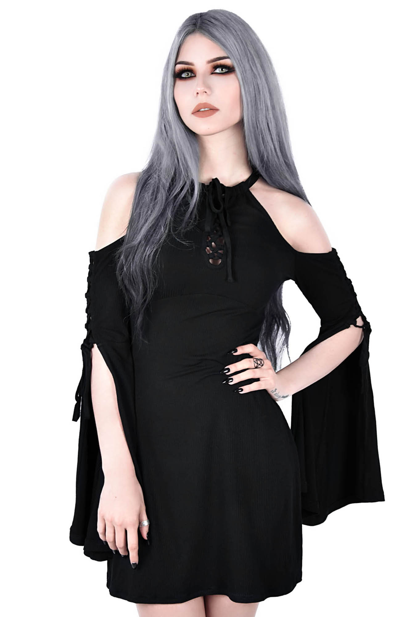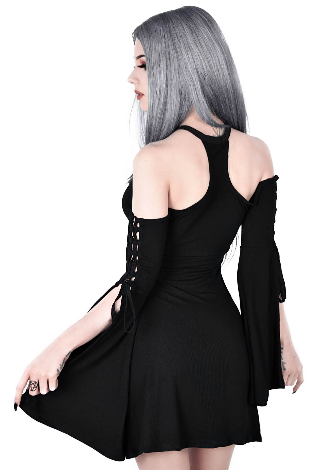 She is the 'Aura' maiden dress; a configuration of lust and darkness - in a soft touch ribbed-jersey; for a comfort second to none! Super hot neckline with a lace-up accent that's matched on both sleeves. Cold shoulders and open statement back - showing off just the right amount of skin. The time has come - enter the sky gate, she is your fate.