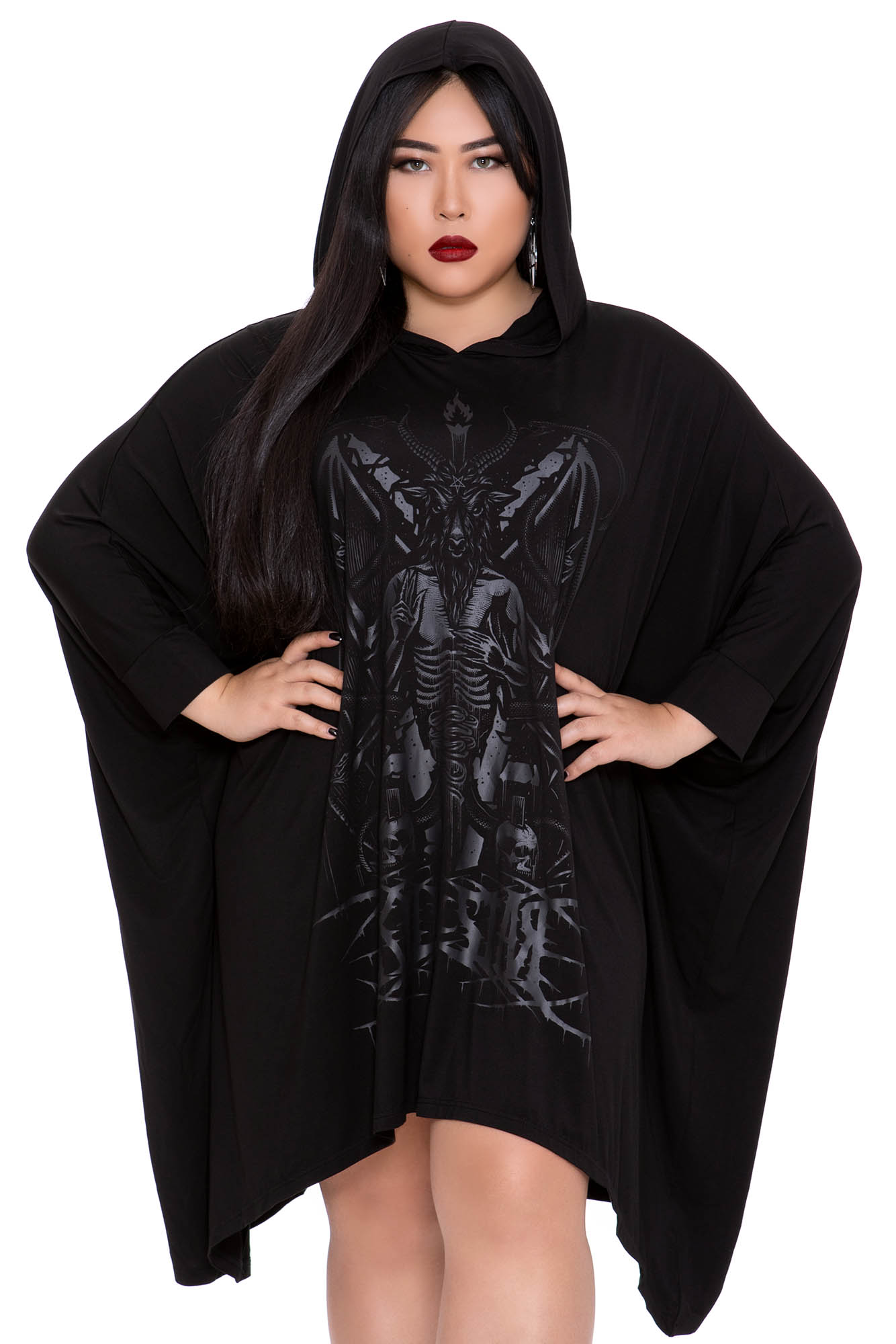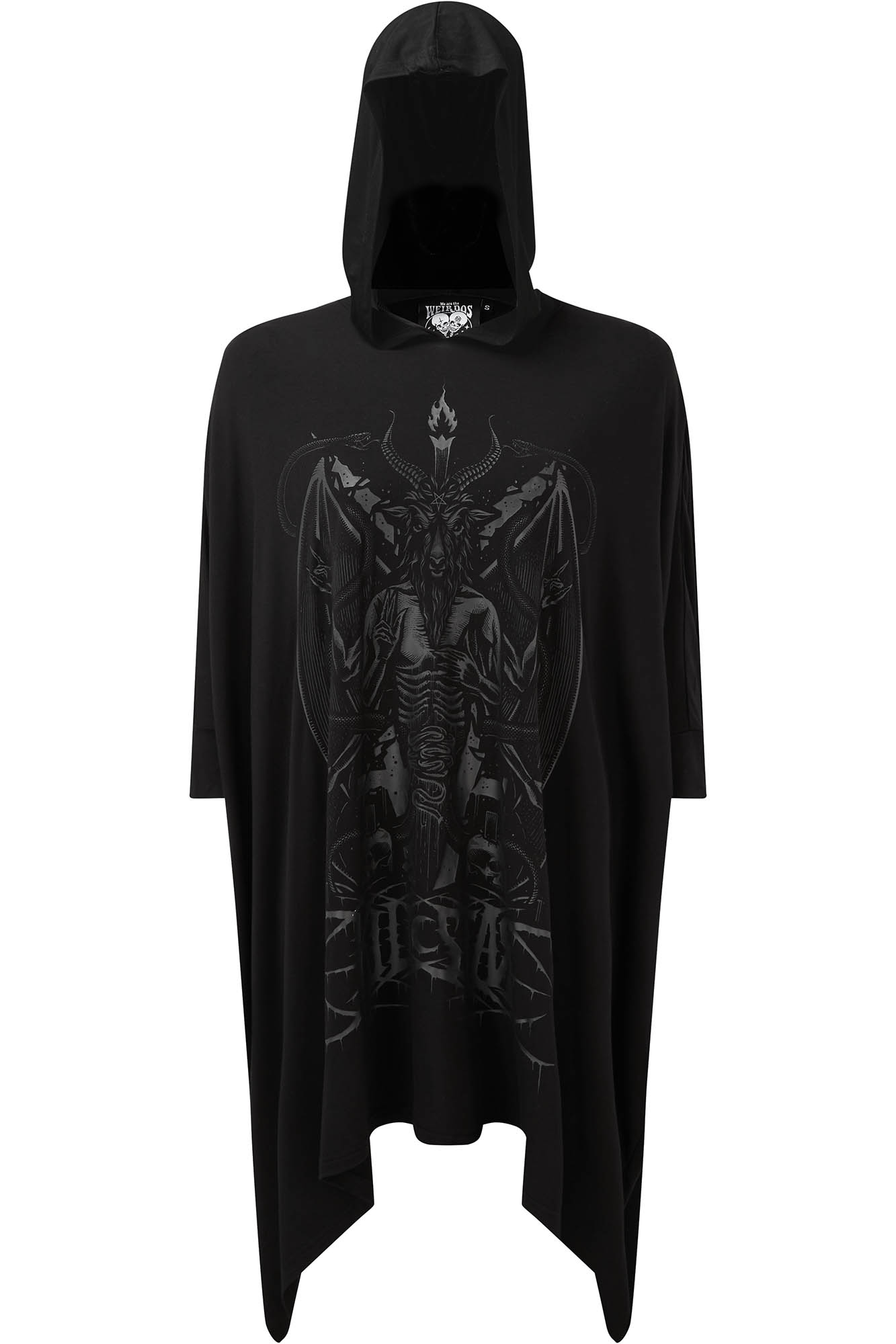 It's a dark paradise! Getting down and spooky with the 'Asura' hood-dress; an oversized body made of the softest stretch-jersey - that flows with movement perfectly! Complete with an oversized hood, batwings and hanky hems - adorned with a large black-on-black print to the chest. Perfect for club visitations, infernal affairs and leaving the crypt at dusk/dawn.
