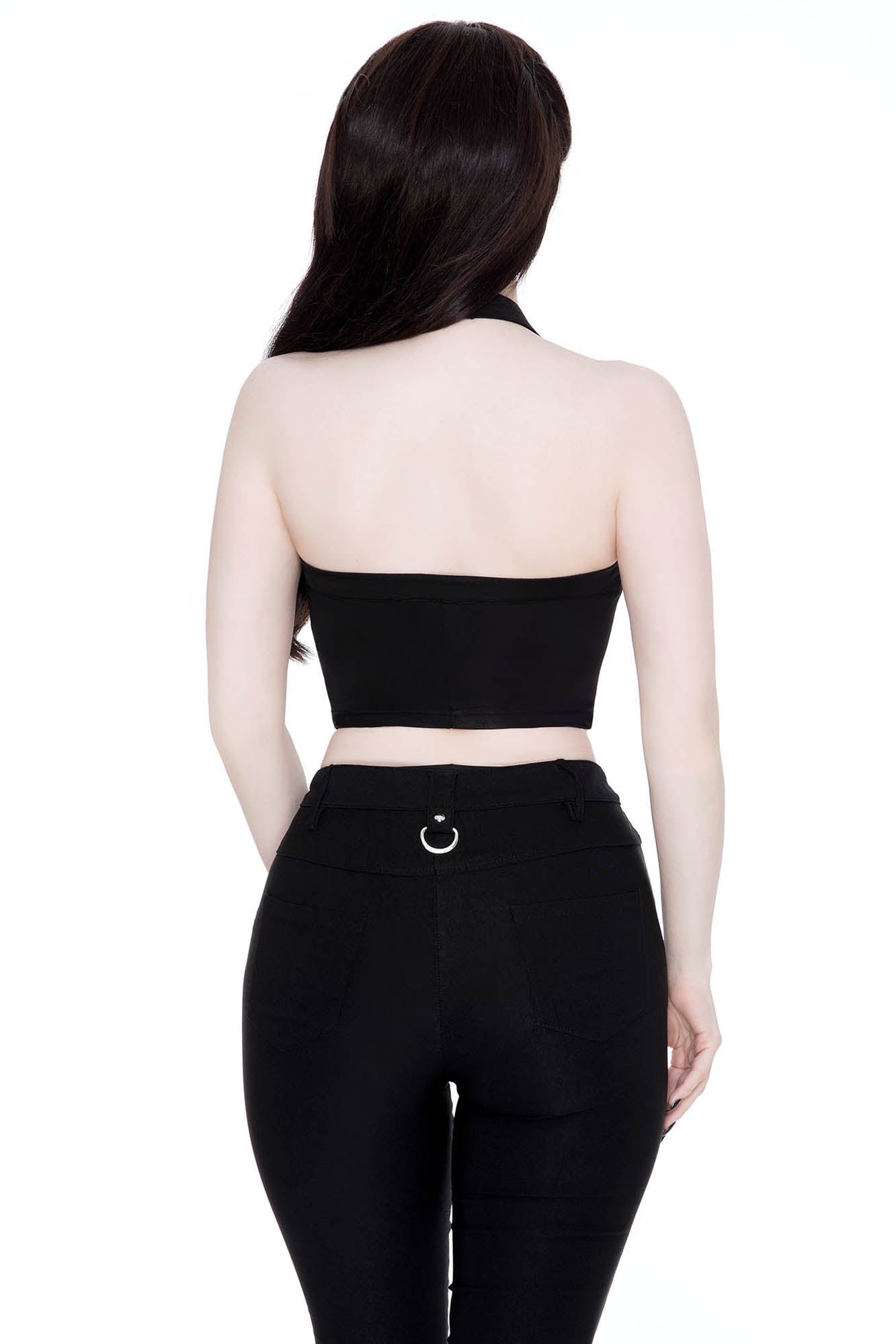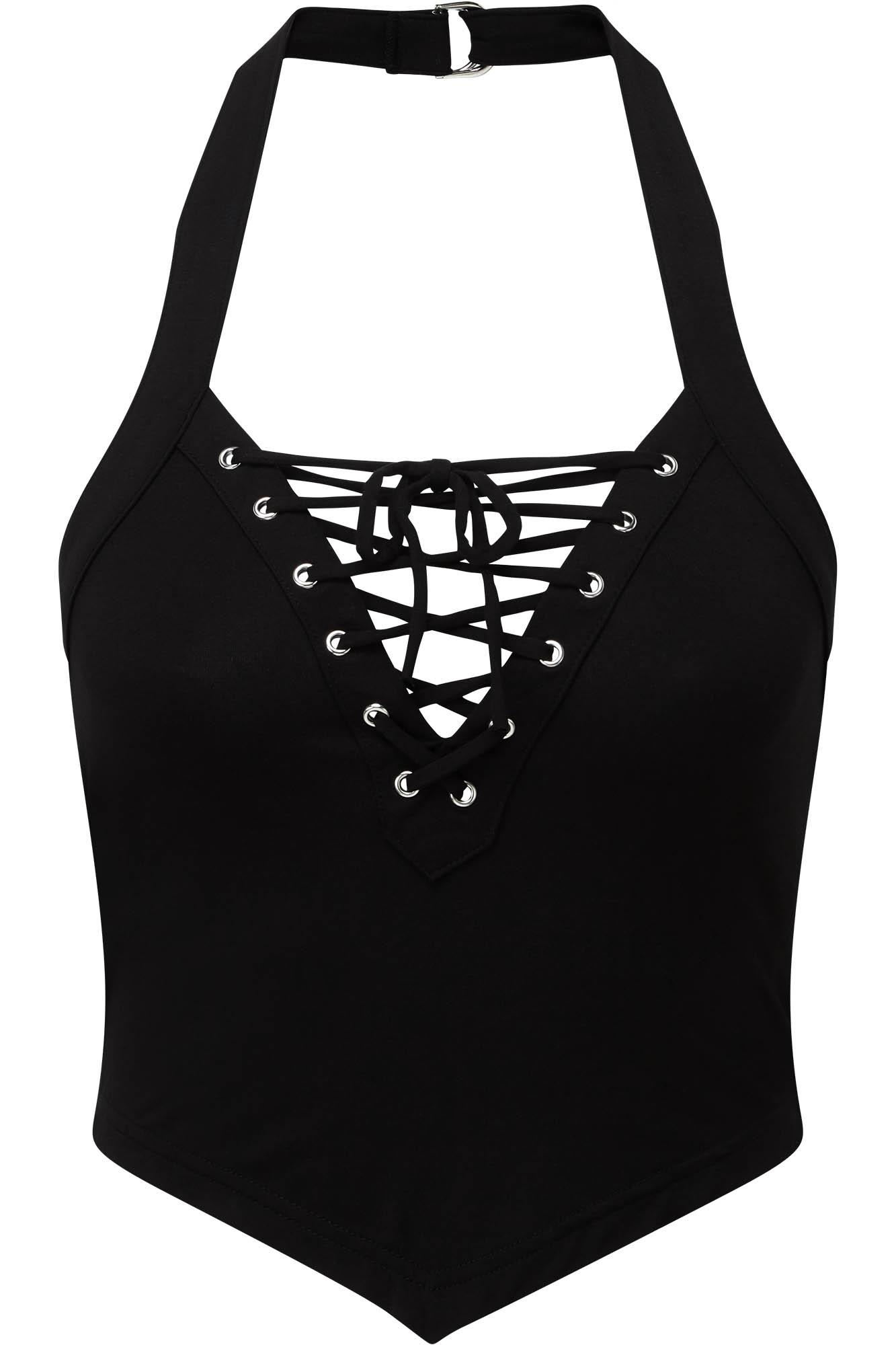 There is a new ghoul in town; cast yer eyes on the 'Axel' vest top - with a light but flattering fit - perfect for hot days/nights/whatever. Soft-touch jersey body with halterneck styling, statement lace-up front and cropped body.