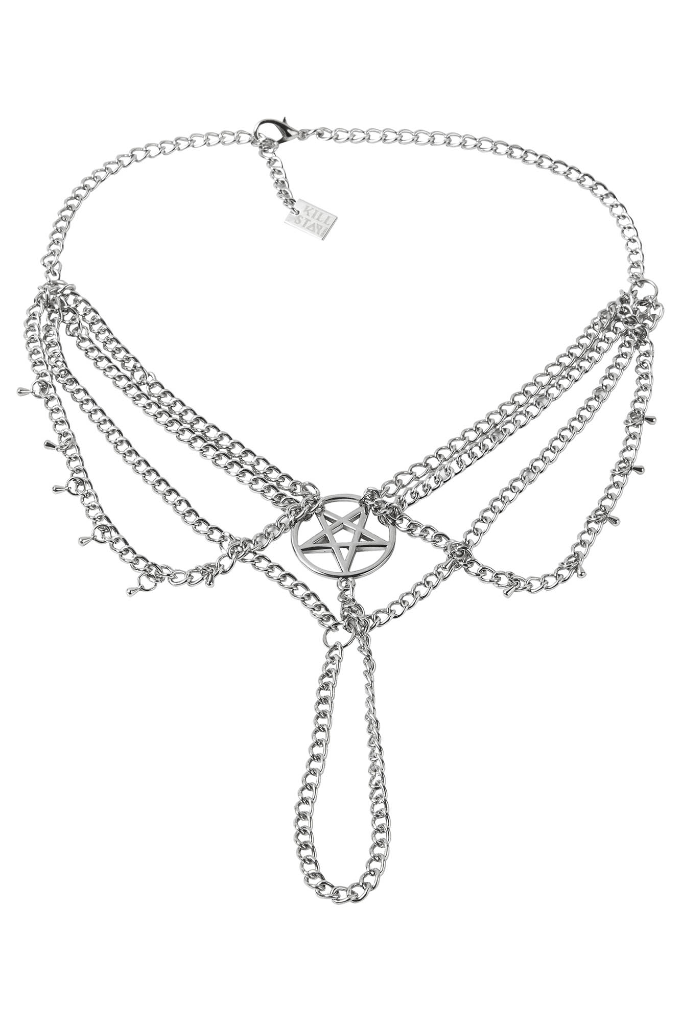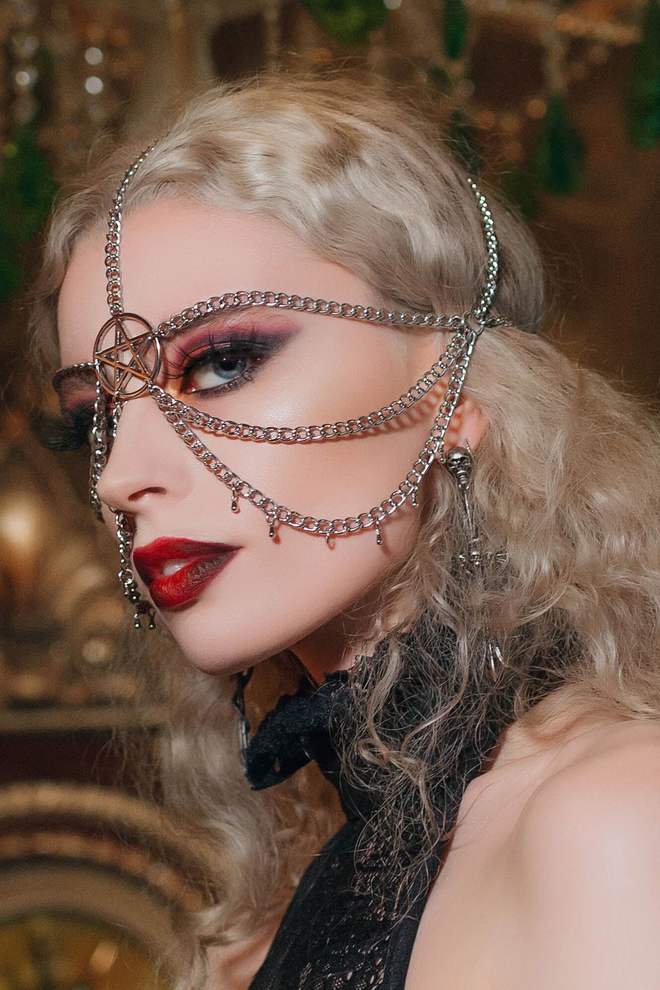 Invoke your inner priestess or simply accessorize like a queen - the 'High Priestess' headdress will instantly inject a magical spark to yer daily rituals. Statement chains in various sizes in a waterfall placement, middle parting and a third eye matrix with a pentagram.