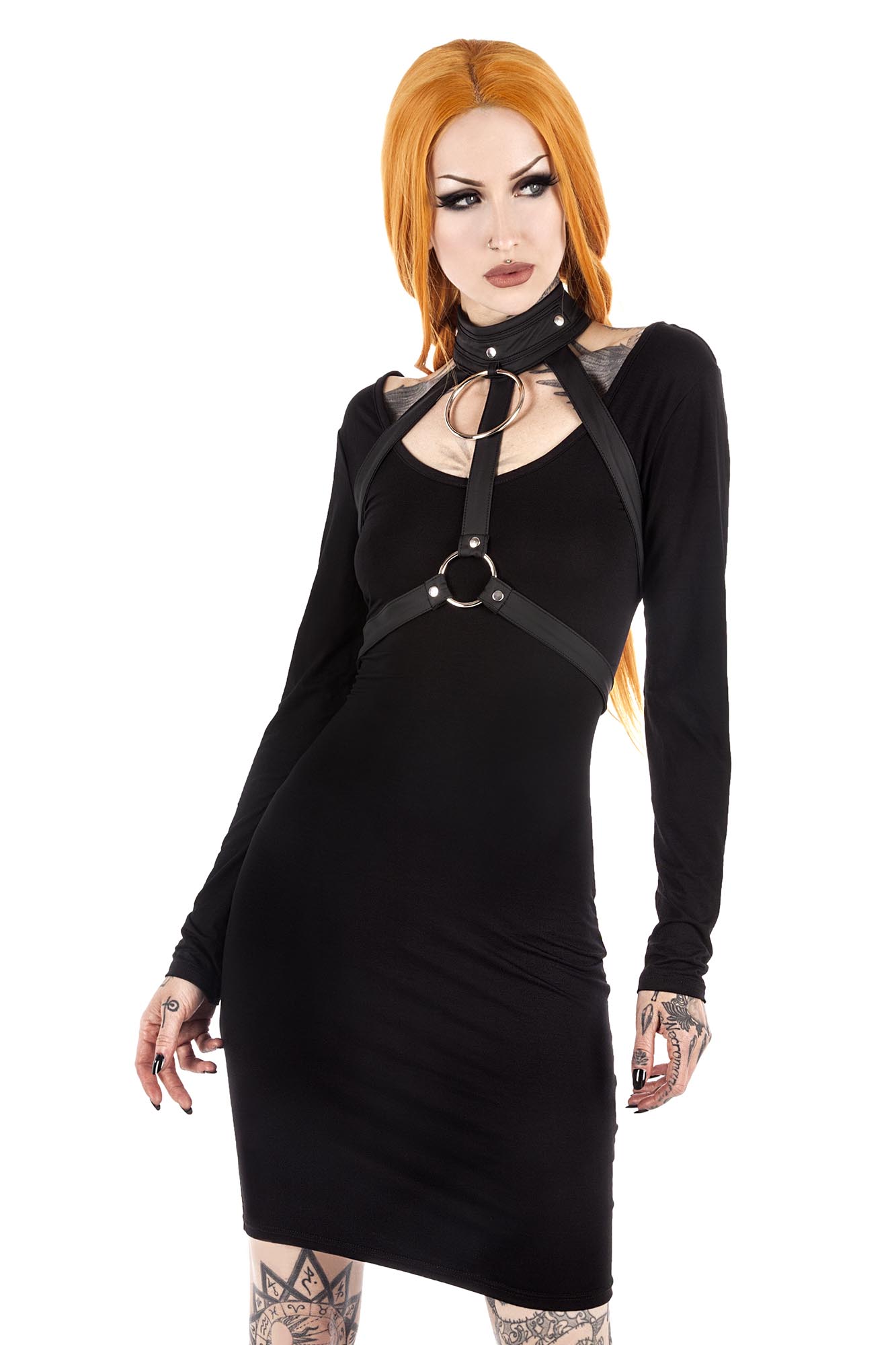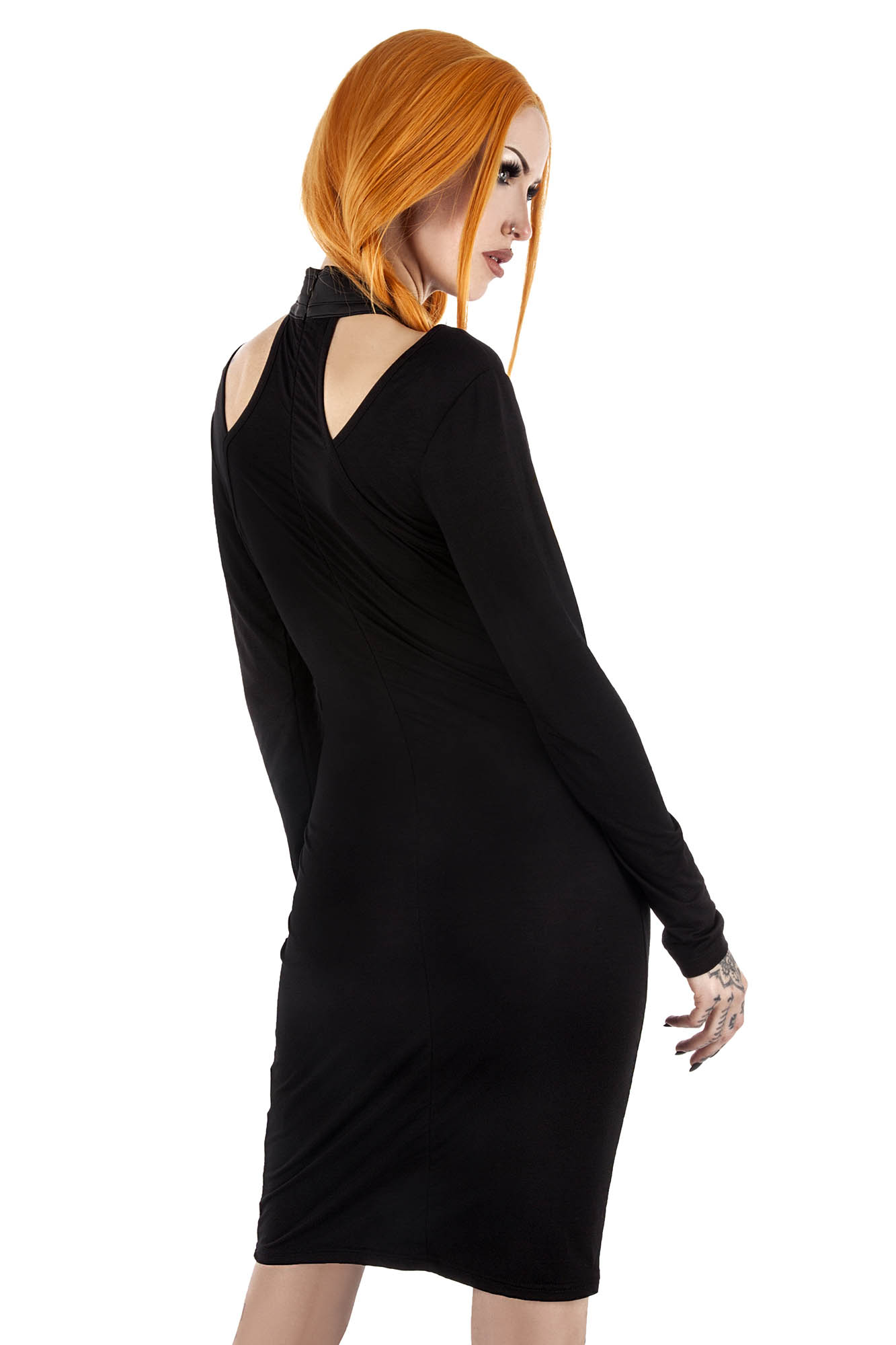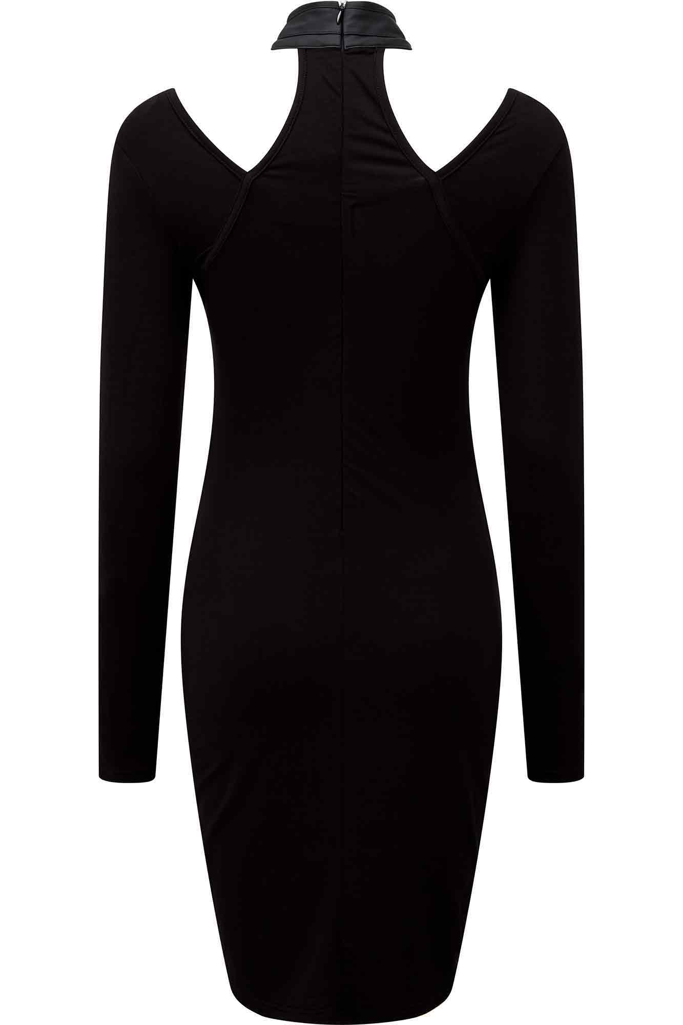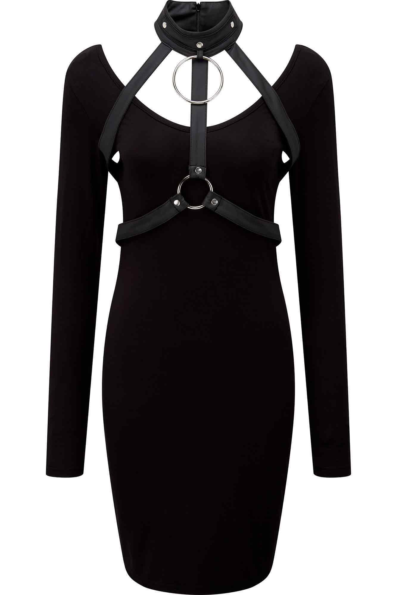 Channeling some mistress tonight vibes with the ultra hot 'Jett Black' killer-silhouette body-con dress; in a luxe soft jersey with deep plunging neckline, faux leather straps, choker neck with large O-ring and zip back for easy on/off. Can take yer plans from lame to flame in a split second - just by putting it on...
