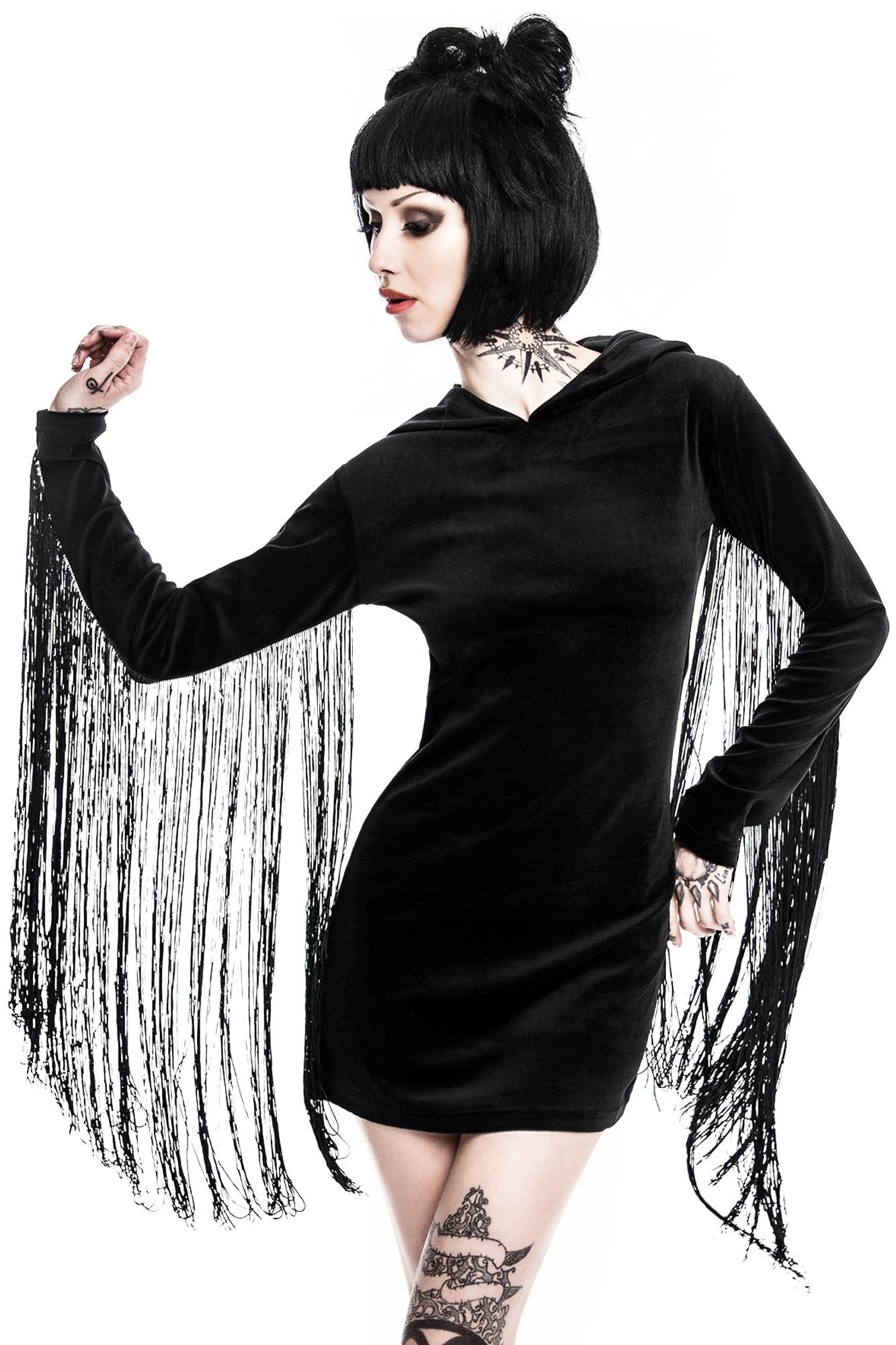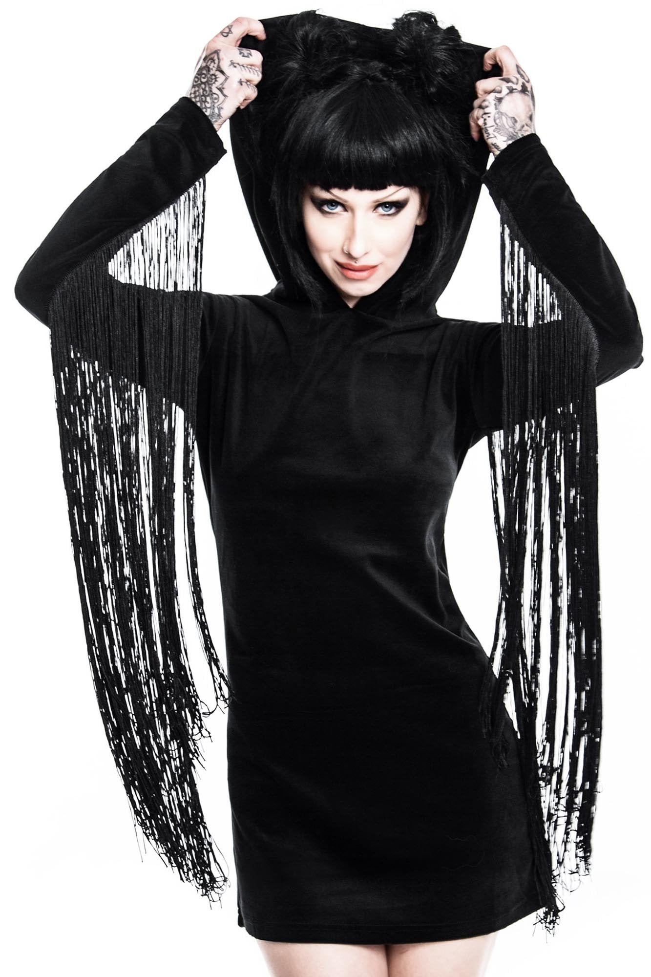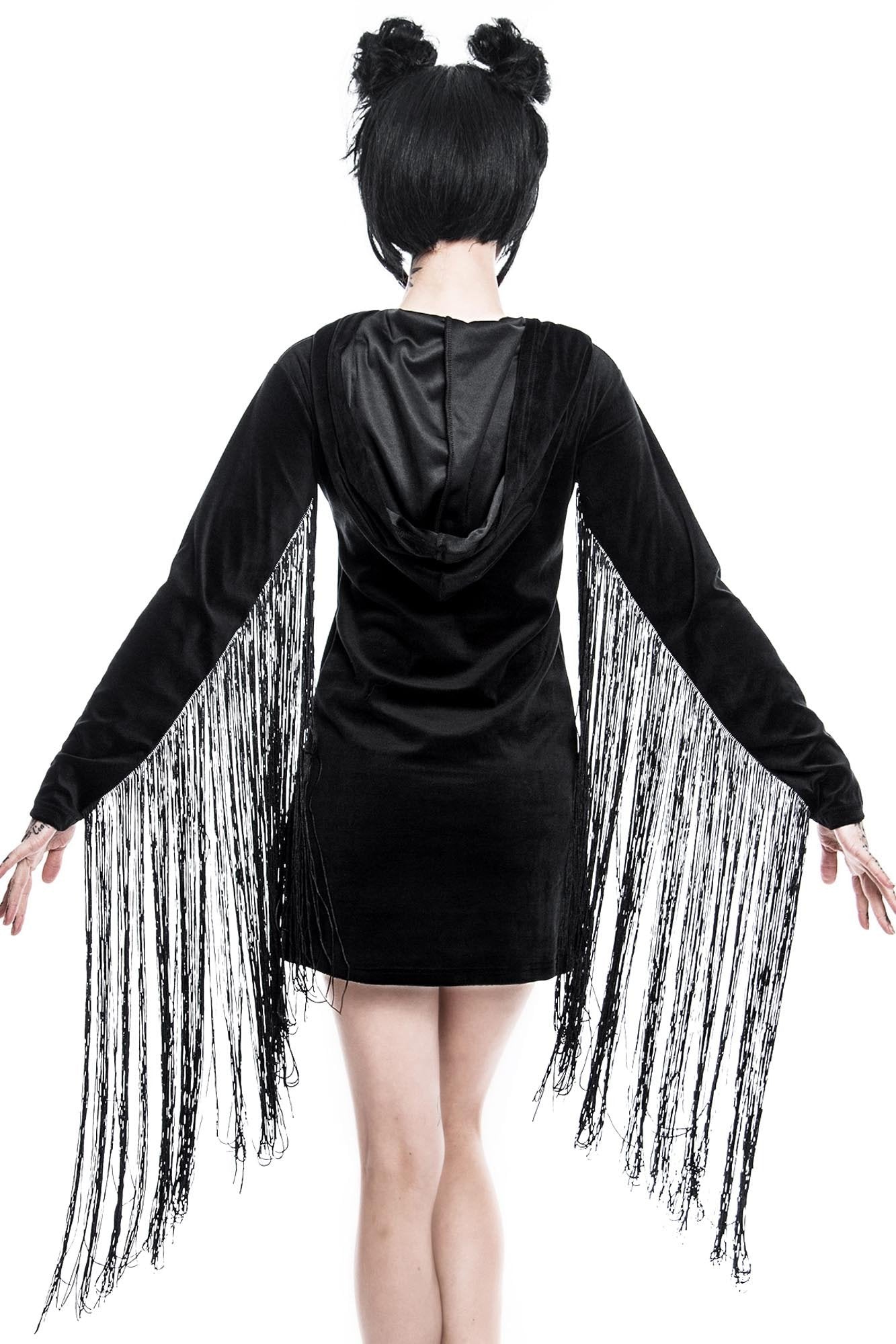 Long sleeved bodycon with with hood and fringed sleeves. Inspired by 70's Witches, dancing barefoot and casting spells to Fleetwood Mac.