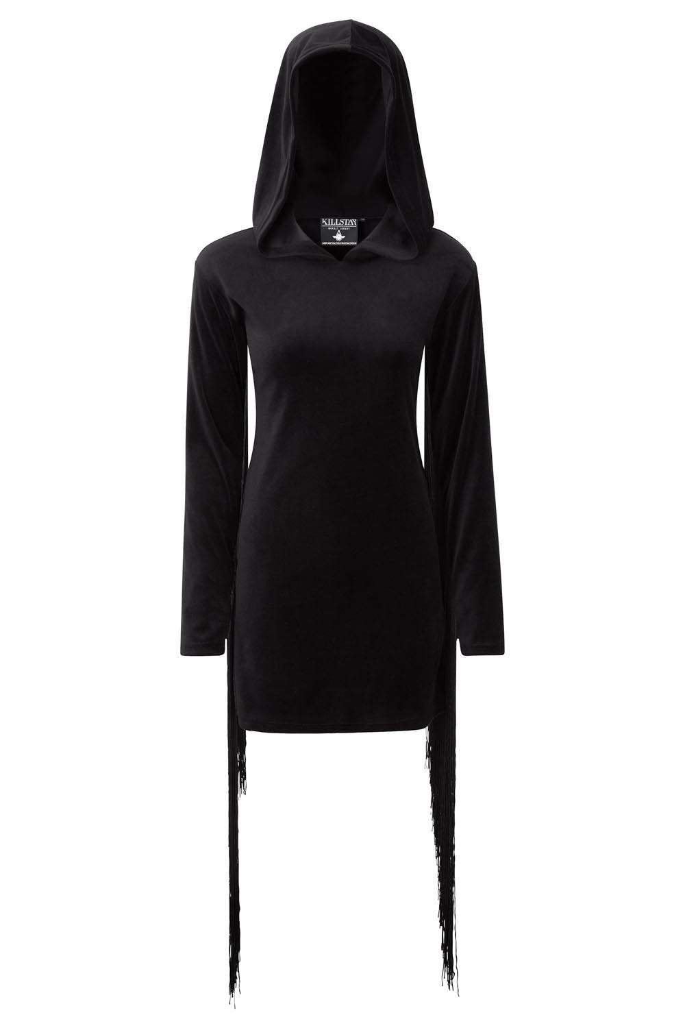 - Soft Touch Luxe Velvet.- Fringed Sleeves.- Large Hood.- Bodycon.- Fitted.