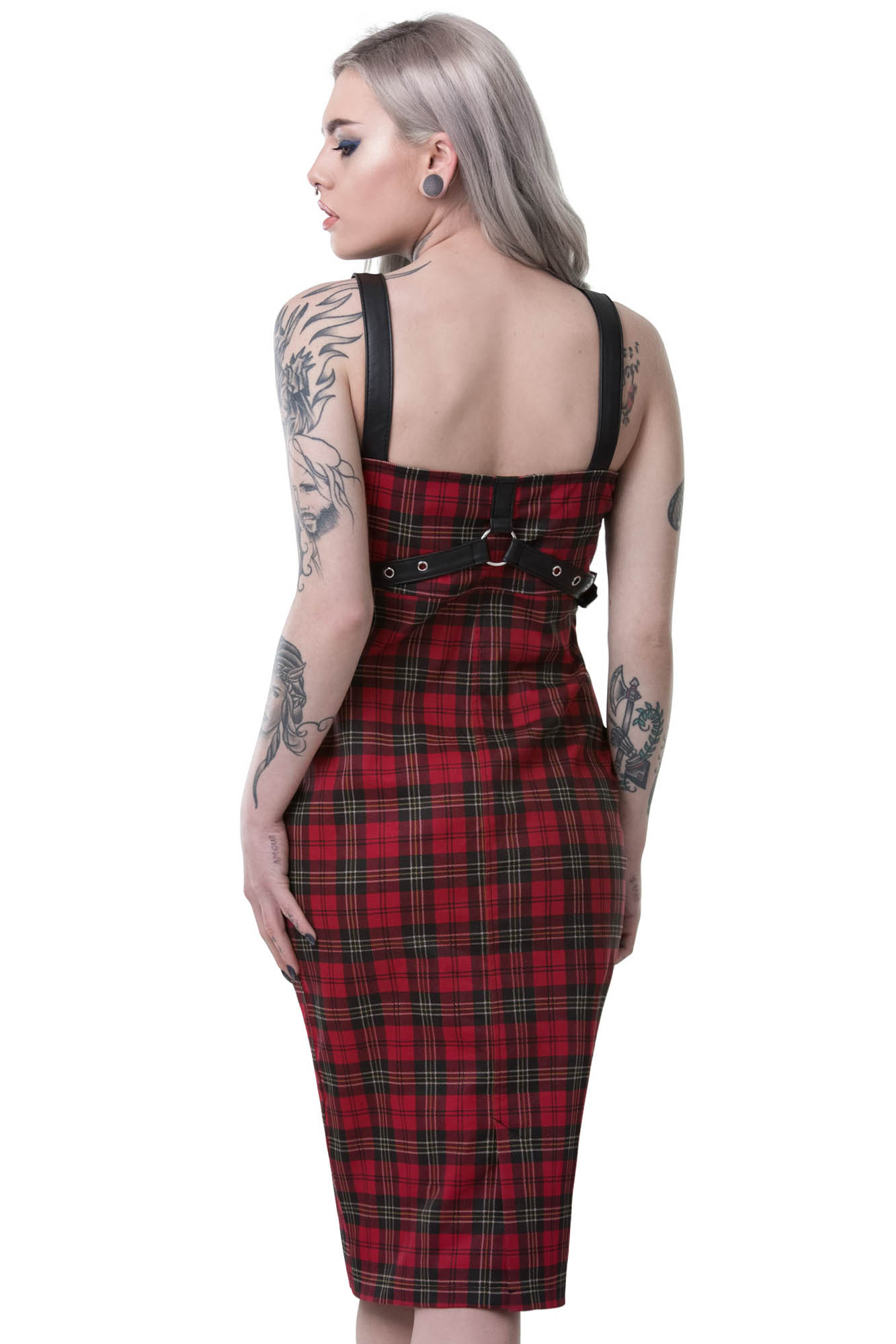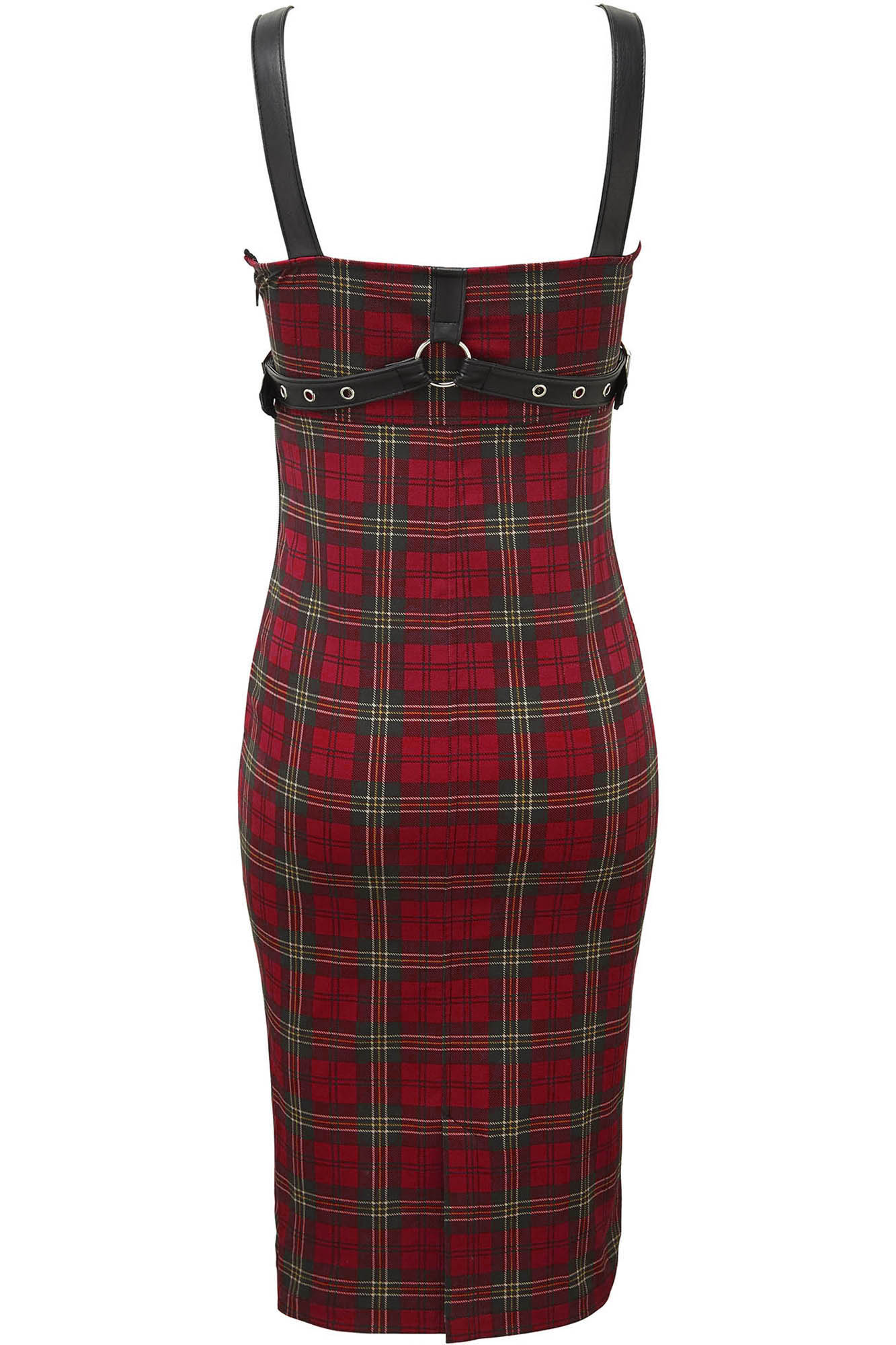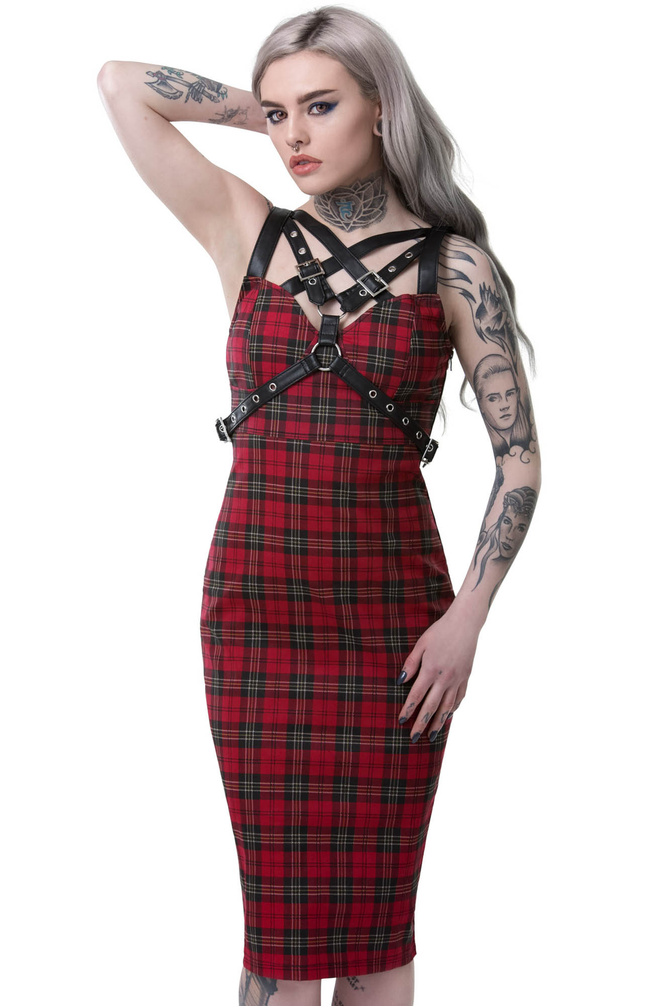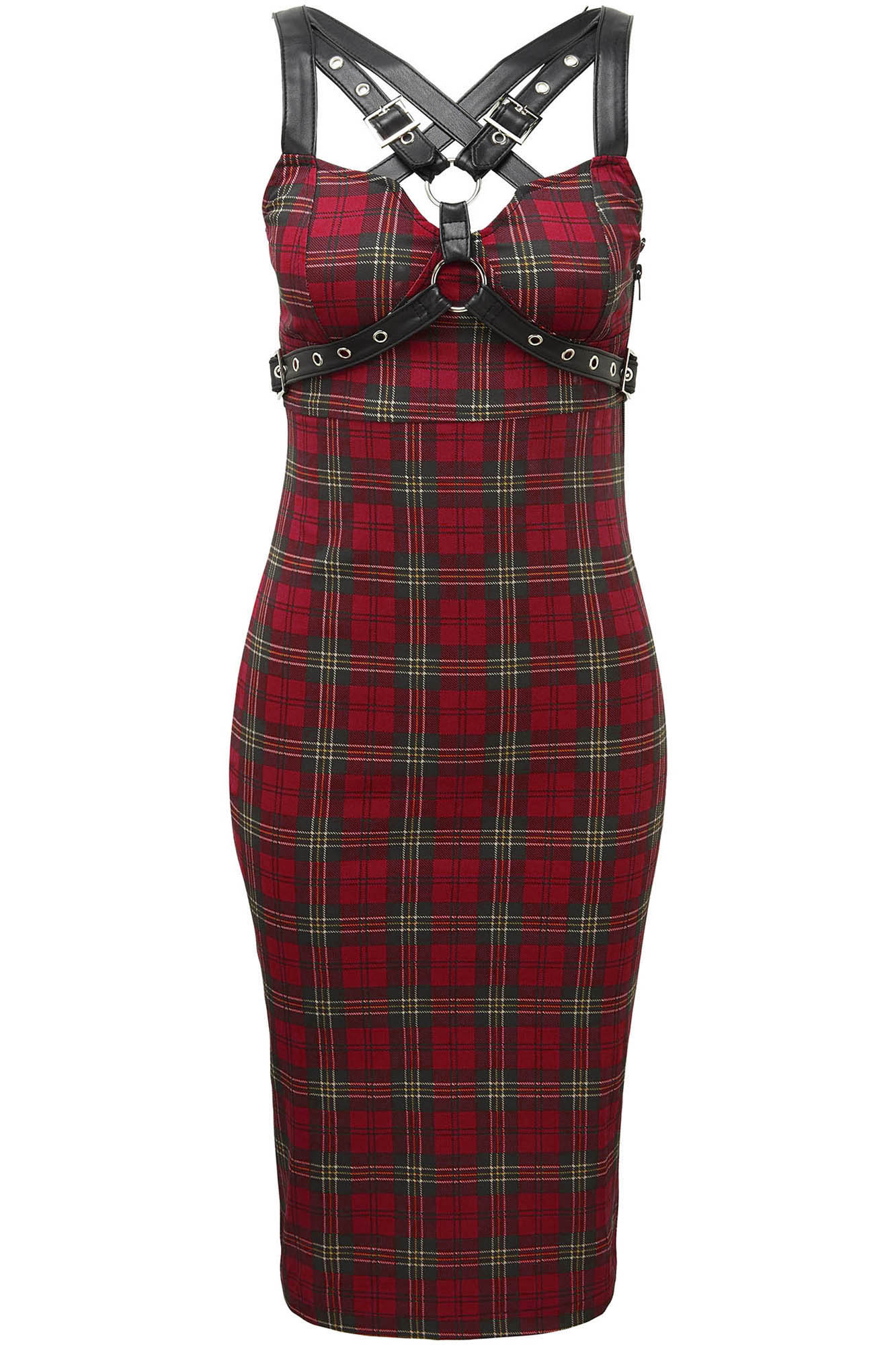 Get into some modern punk feels with an all-over tartan dress that fits like a glove; 'Riot City' channels yer sexy looks whilst keepin' all the details on point. Body-defining stretch cotton-jersey with bold bondage strap feature to the chest [to protect the goods, duh], zipped side for easy on/off and flattering mid-length with slit.