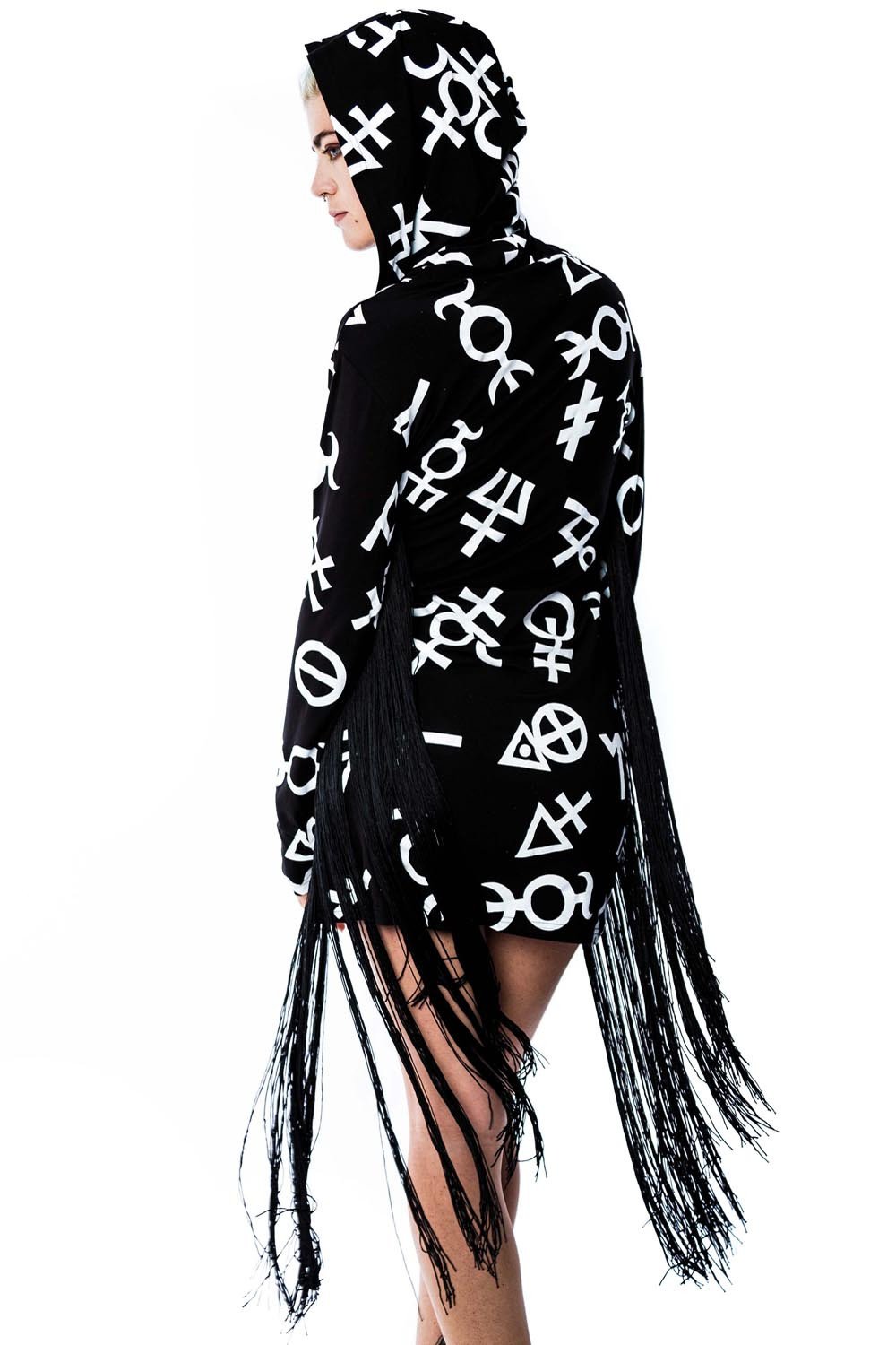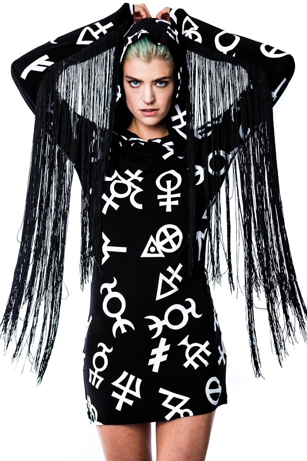 Long sleeved bodycon with with hood and fringed sleeves - and rad statement print. Inspired by 70's Witches, dancing barefoot and casting spells to Fleetwood Mac.